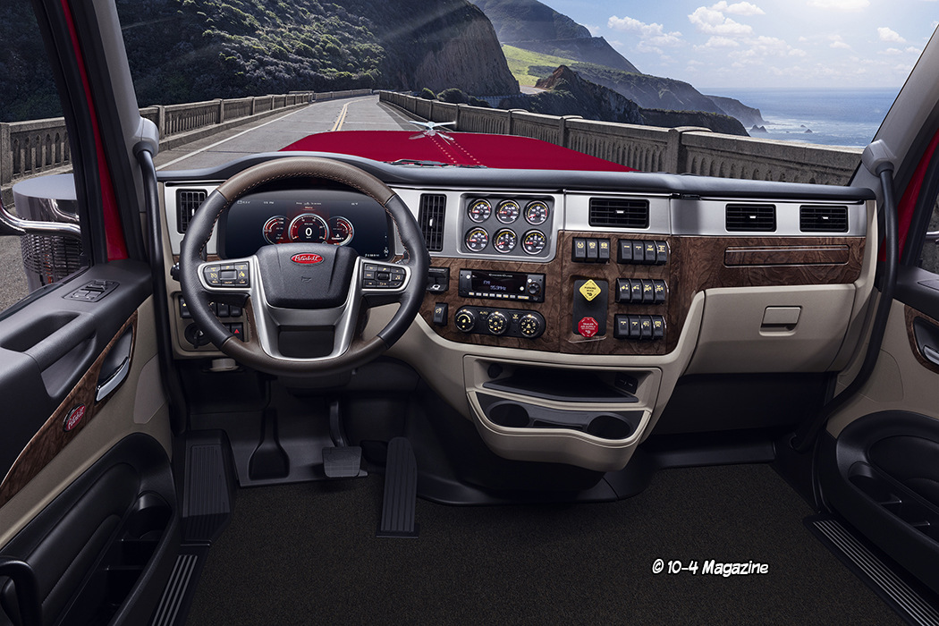 The styling of the 589 is supported by the most advanced engineering and innovative technologies like air-assisted hydraulic clutch (manual transmissions), the newest collision mitigation system, and predictive cruise control. Extensive feedback was provided by Peterbilt drivers who contributed to the design and style of the interior of the cab and sleeper. Access to the cab was improved with larger tread steps for easier entry and exit of the cab. A new and upgraded digital instrument panel was designed to reduce glare and provide better overall visibility for the driver.