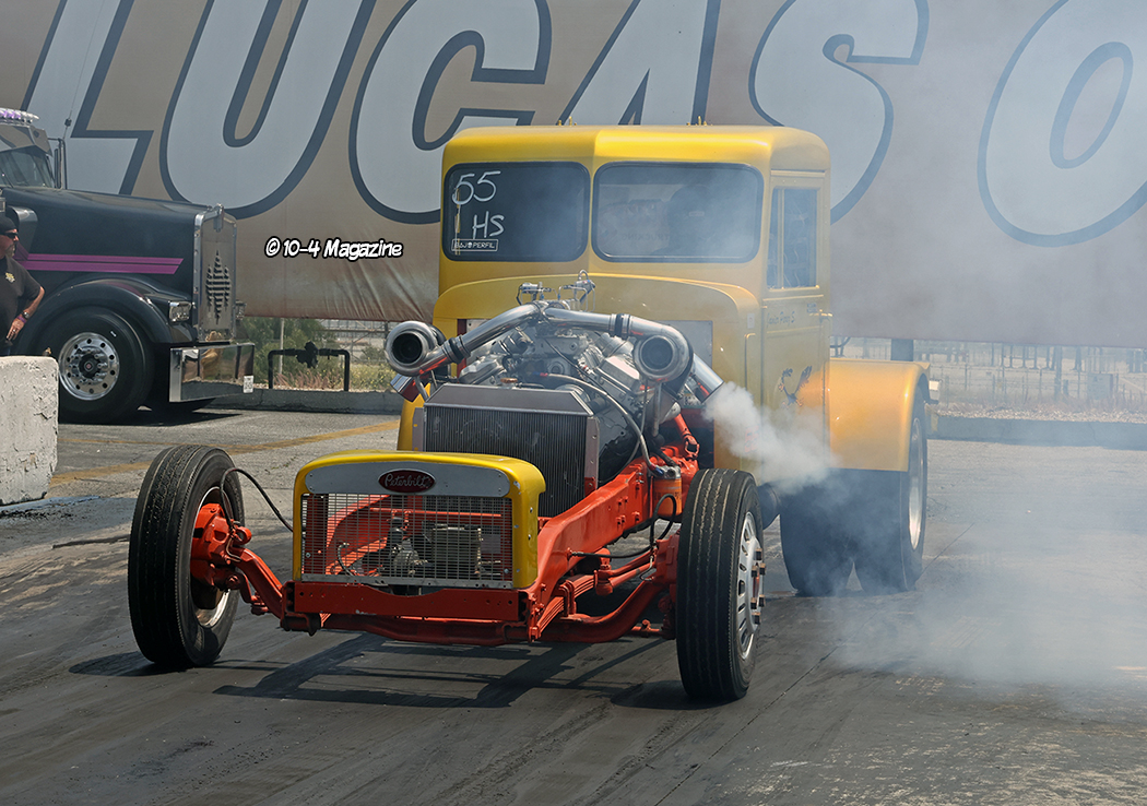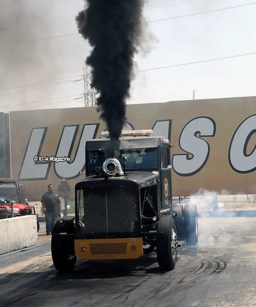 The Super Drag Truck class seemed like an international affair, with Mario Monette of Canada taking the winning position followed by Carlos Sanchez with his maroon truck dragster “El Bandito” from Tijuana, Mexico.  If you attended TFK last year, you witnessed Mario unfortunately blow a fuel line at the start which caused a fire, but he vowed to rebuild and return stronger than ever, and he didn’t disappoint.  Longtime TFK supporter and racer Mark Tarascou (and past 10-4 cover trucker) won the Best Burnout award with his hopped-up faded blue Peterbilt 359 dump truck.