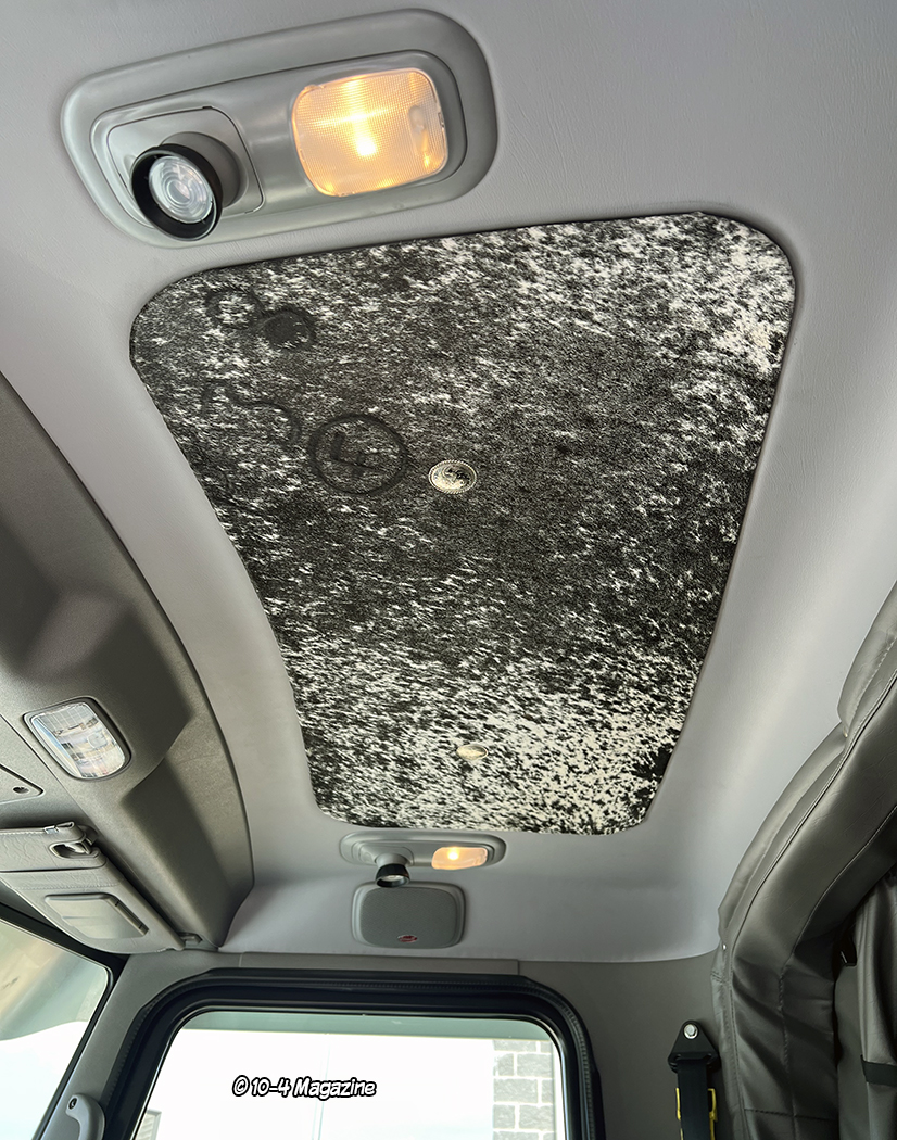Charlotte thought the truck should have a cow hide interior, so they found some beautiful hides, and then Cody did an awesome job coming up with a way to make it flow – he even made James his own JMT brand for the driver’s door.  The last truck we repainted the frame and it has held up so well that we repainted the frame on this one, as well.  Tyler welded up some single square headlight buckets, and Cody installed a 379-style grill, one of my body drop kits, a KopyKat visor, matching door chops, stainless breather panels, mirror lights, straight stacks, cab and sleeper skirts, and stainless Hogebuilt half-fenders.  We also painted the fuel tanks and moved them out to resemble fatter tanks, added a painted flush Merritt deck plate, a new rear crossmember, and a Jim Crain rear light bar.