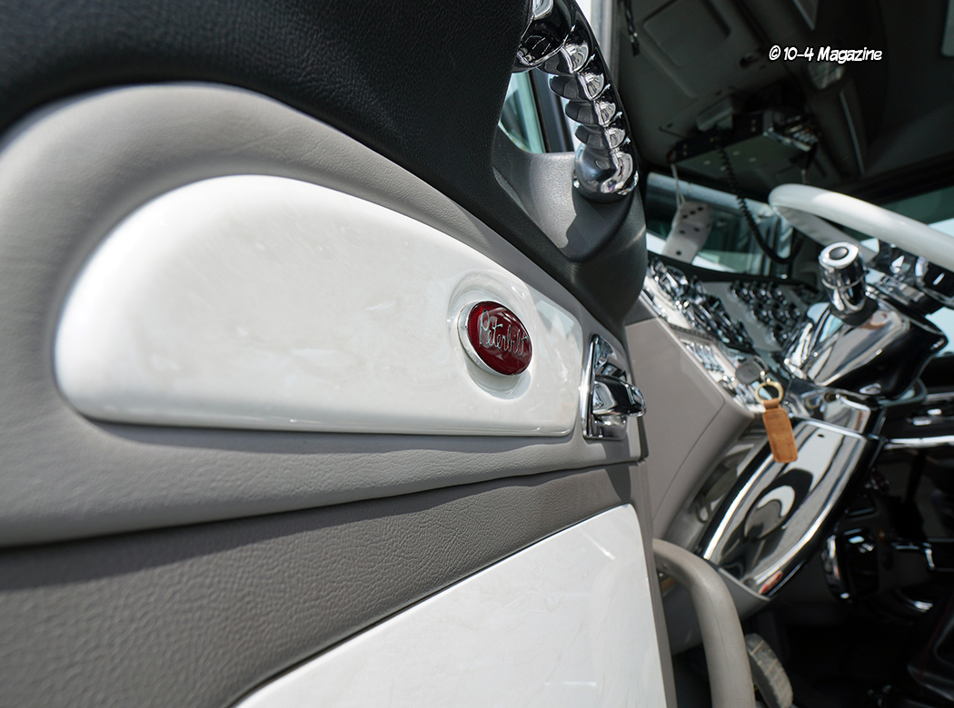 The pictured white with maroon frame truck is a 2016 Peterbilt 389 glider with a 36-inch sleeper, a CAT 2WS under the hood, a 13-speed transmission, 3.70 rears, and a 280-inch wheelbase.  This sleek truck is accessorized to make it look clean and classy without being overdone.  It sports an 8-inch exhaust, a Lincoln Chrome visor, and a 20-inch bumper with a 12 Ga. Customs lift.  Also, adding to the sleek look, are Shift Products half fenders, color matched Fibertech 6-inch body drop panels, and a complete interior showcasing all Rockwood products.
