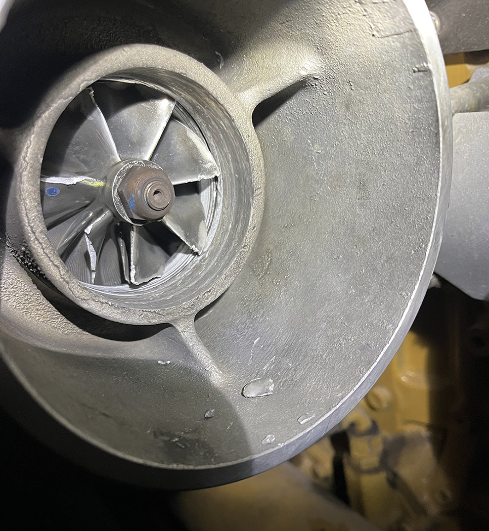 Finding a charge air cooler was much more difficult. The type I use comes from Louisville, Kentucky, and has a lead time of three or four days to get it shipped. Thanks to Old Dominion (the trucking company), they had to send five separate packages because of damage caused during shipping. It’s a good thing there was a factory takeoff in my shop, because it ended up being two weeks before I received one I could use (I didn’t want to reuse the old cooler since some small pieces of the turbo were missing when I inspected the compressor wheel). Most likely those small pieces are loose inside the tubing and there is a possibility those chips could pass through the intake and find their way into the head or the combustion chamber. I’m not willing to gamble a $50K engine on a thousand dollar charge air cooler. At a later date I will clean the old cooler and try to locate any chips before I place it back on the shelf for future use.