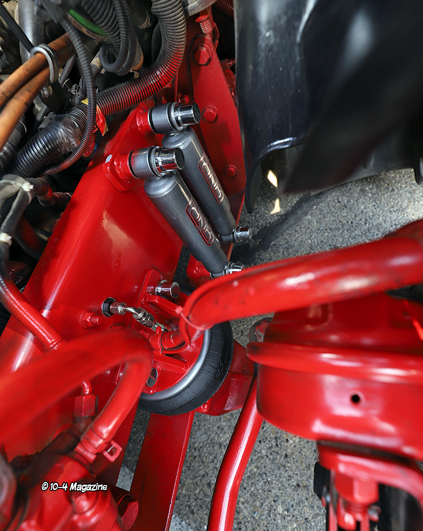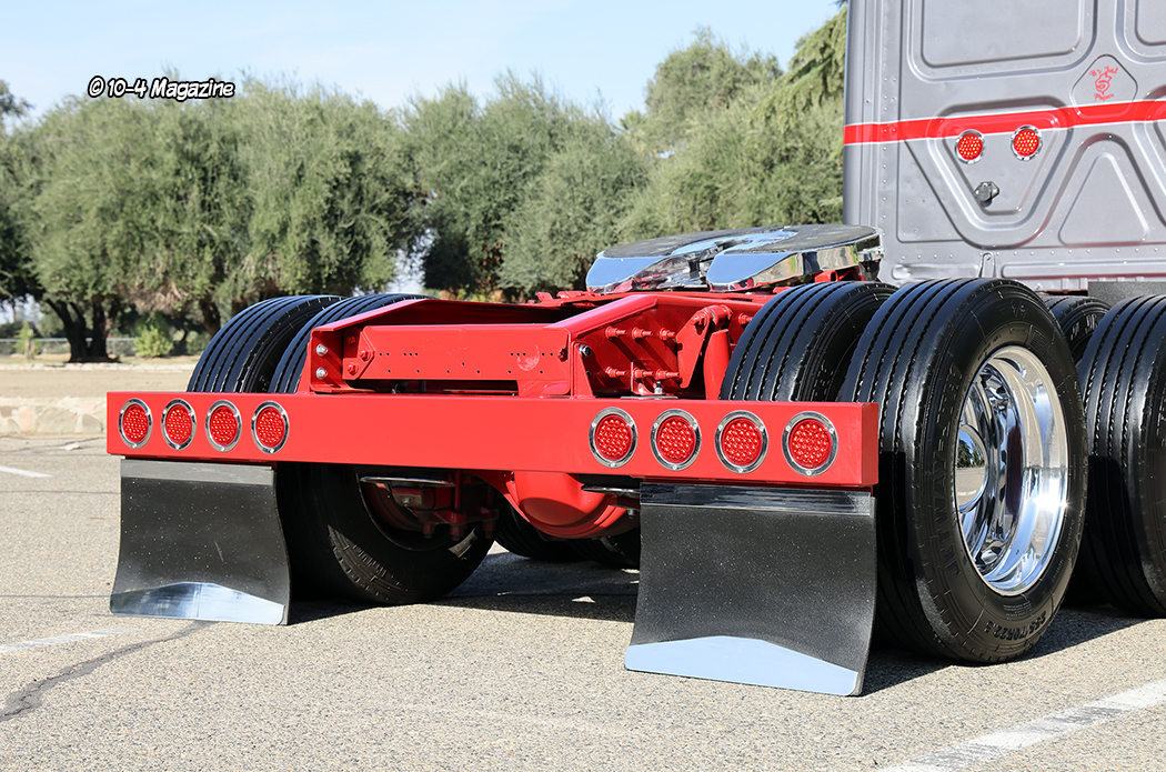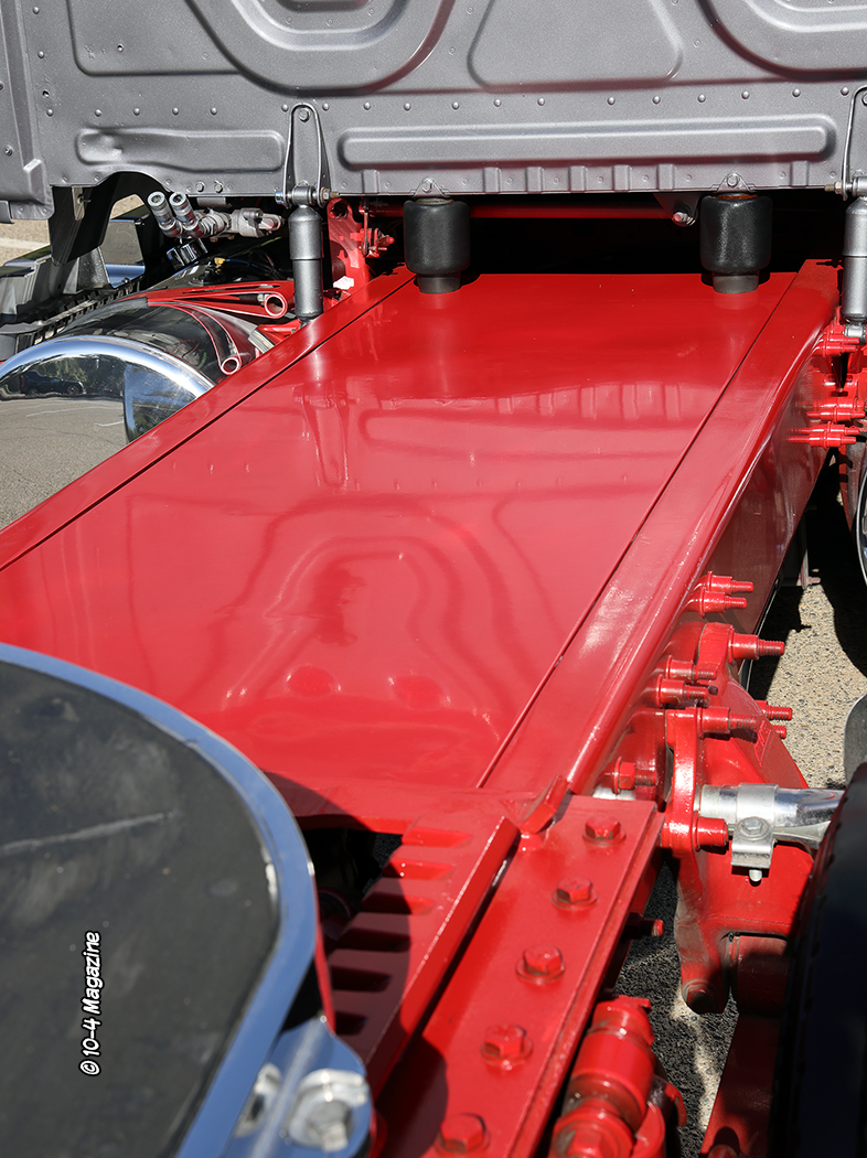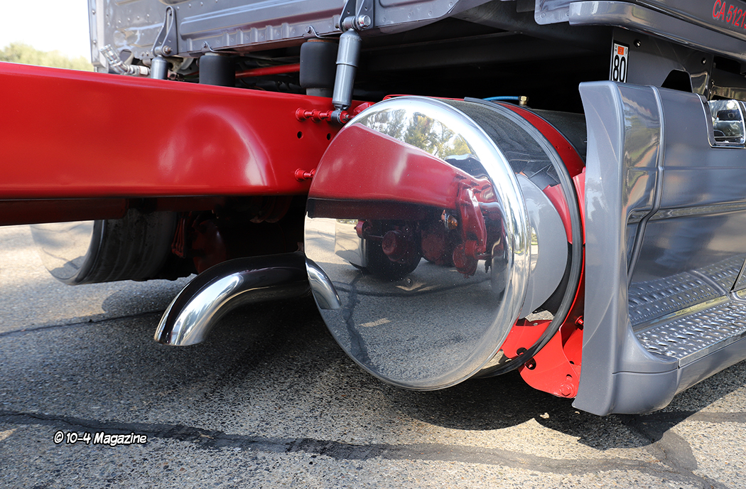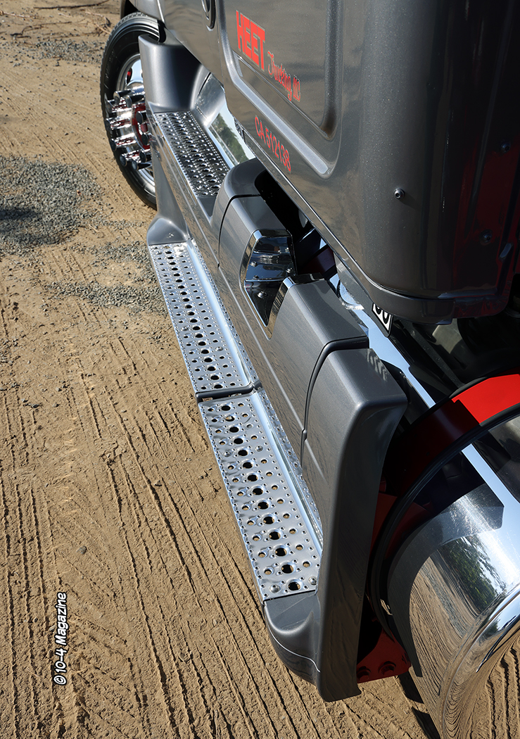 The 2015 Freightliner Cascadia was bought in 2022 with relatively low miles (398K). It is powered by a 12.7L Detroit DD13 hooked to a 10-speed transmission. Kenny decided it would probably be around for a while, so he wanted to fix it up like the Peterbilt. He also thought it would be fun to build a customized Cascadia, as you don’t see many of those out on road or at truck shows. Noah built a custom air ride system for this truck, too, and then painted it Peterbilt Metallic Grey, added a red stripe, fabricated a custom deck plate and rear light bar, and shaved all the frame bolts. The chassis was then painted red to match the stripe.