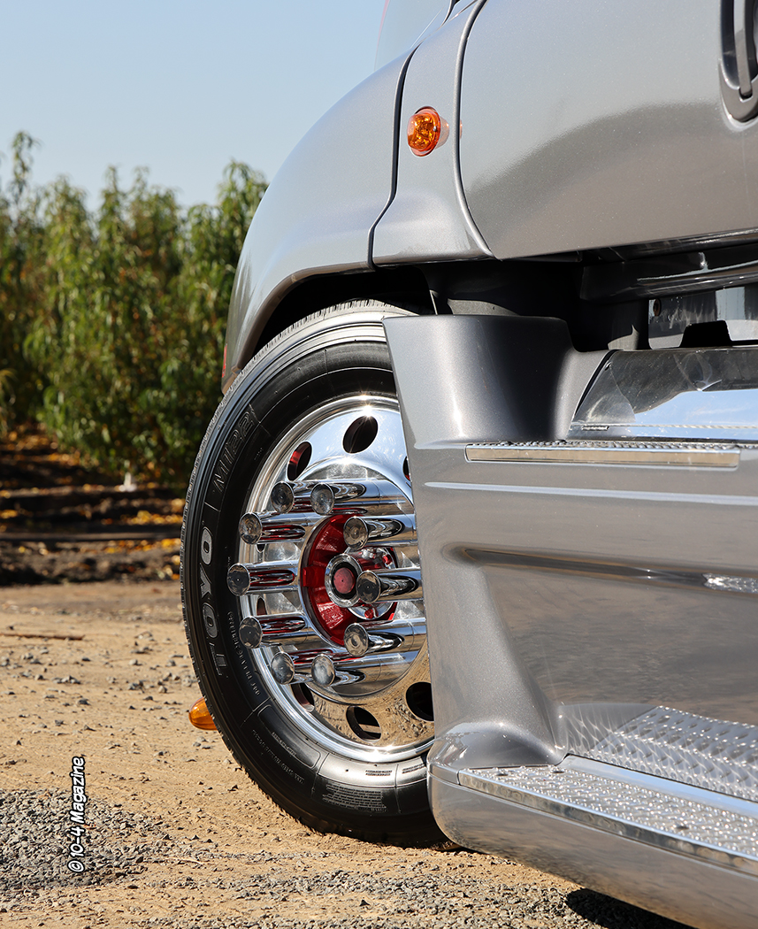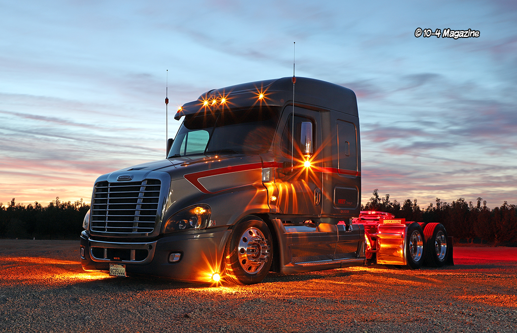 We have never had a Freightliner Cascadia on our cover, mostly because they are usually not worthy, being primarily plain white fleet trucks and such. However, we are always looking for something different and unique, so when we saw Kenny’s Cascadia sitting there all polished up and laid out on the ground, we had to find out more about the truck and its owner. And, as usual, the people behind the truck did not disappoint. We had a great time getting to know Kenny and his wife Claudia, along with their in-house customizer and friend, Noah Rios of RNR Custom Rigs, who did all the paint and fabrication work on this – dare I say – fabulous Freightliner.