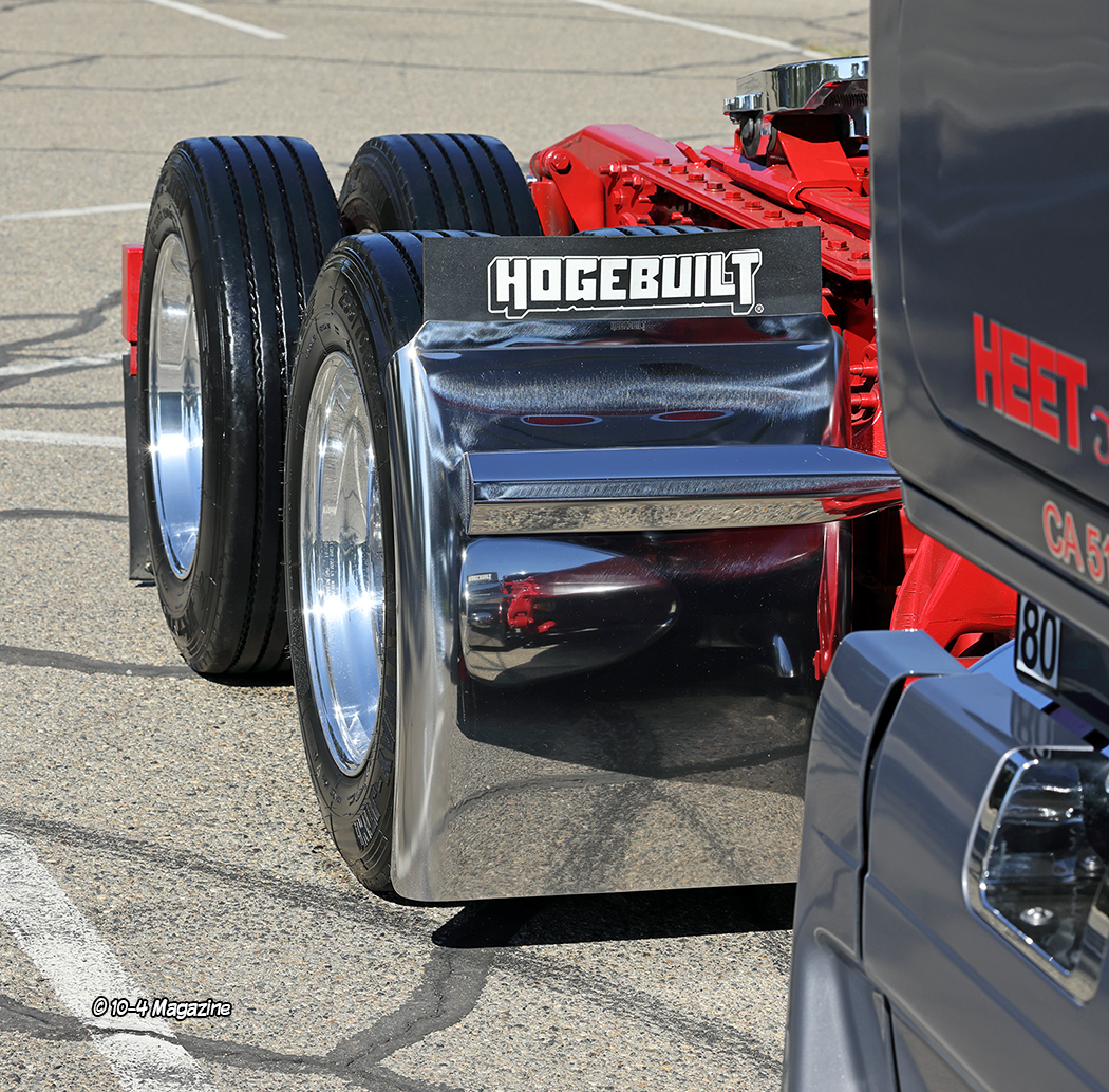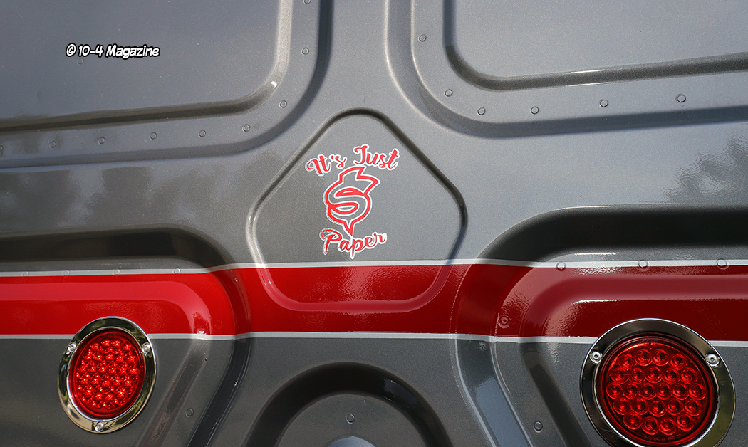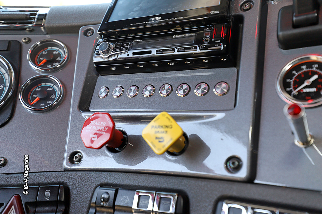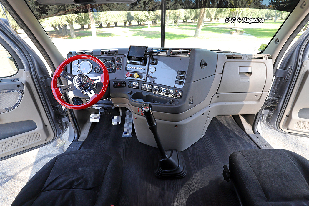 Other embellishments to the rig’s exterior include customized and shortened side fairings to allow the polished aluminum fuel tank to show a bit, HID headlights, extra lighting with glass lenses, Hogebuilt stainless quarter fenders, and four load lights along with the phrase “It’s Just $ Paper” on the back of the sleeper. The single stack vertical exhaust was switched out to a weed burner system underneath. Inside, the truck got a black wood laminate floor, painted dash panels, billet foot pedals, and a polished and painted (red) steering wheel. The stock factory steering wheel was equipped with all kinds of controls that were moved to a custom panel with buttons on the dash, just under the stereo.