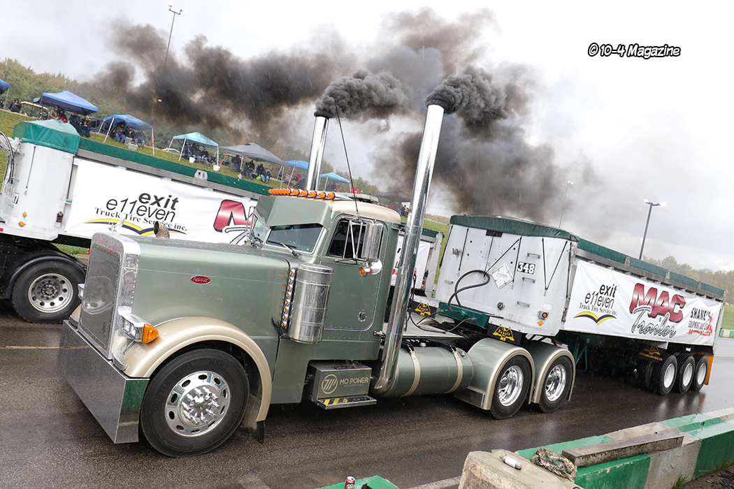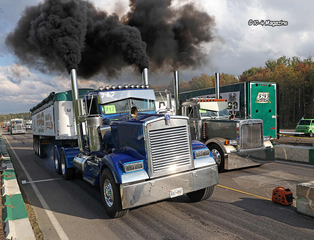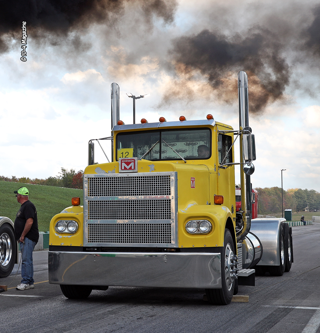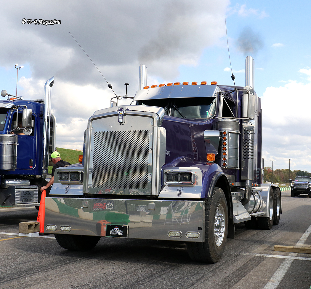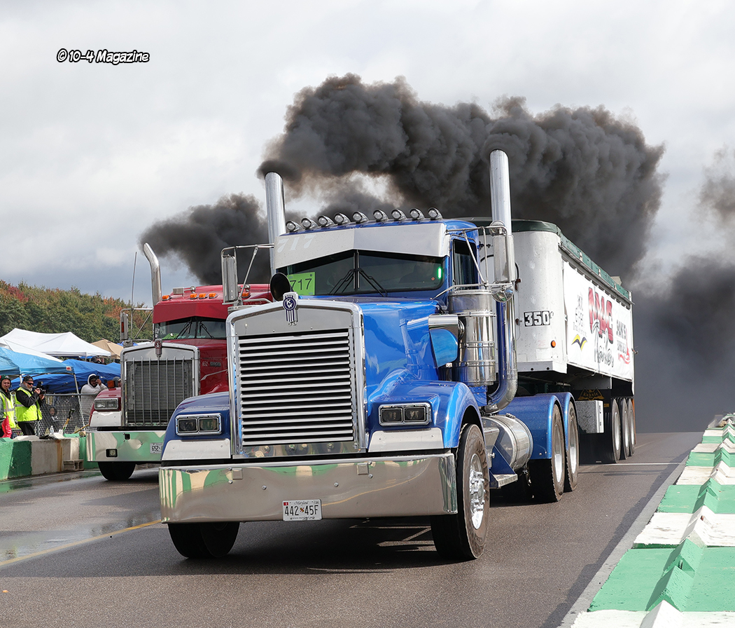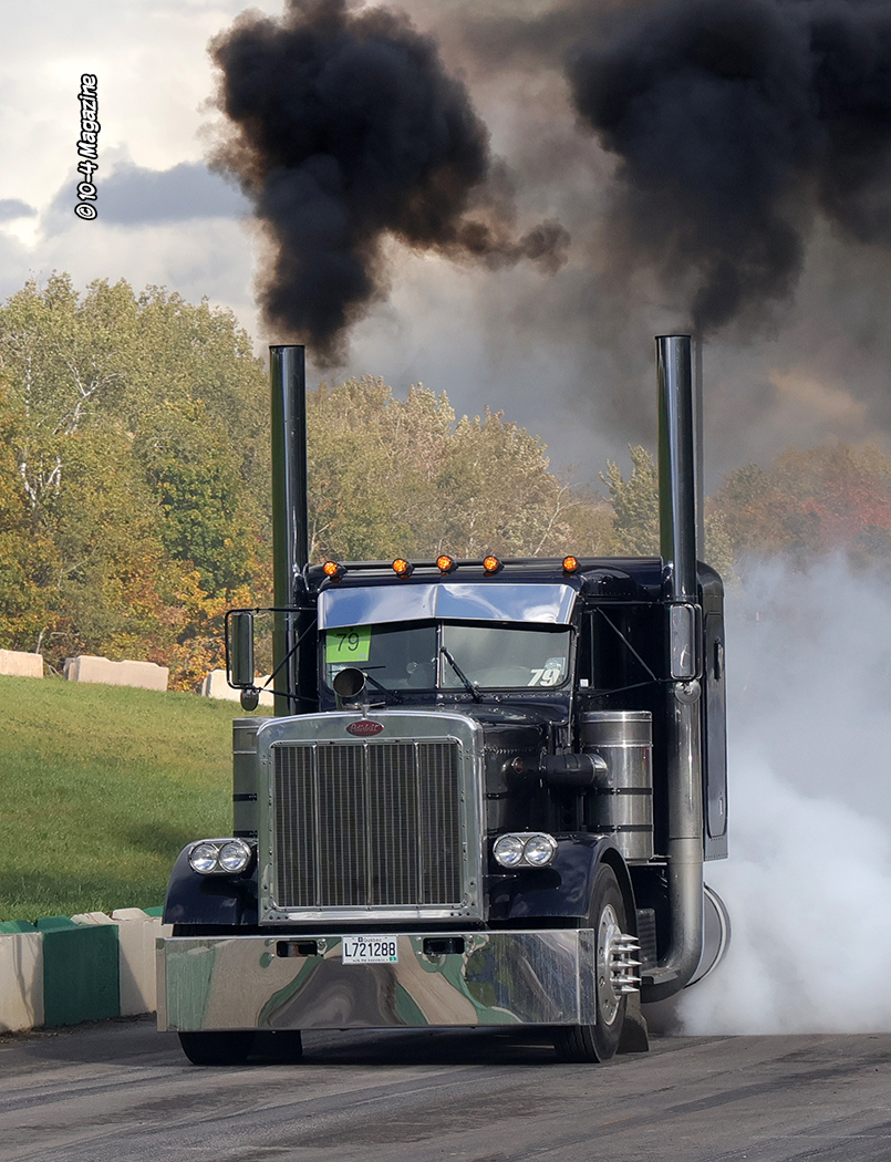 Some other “incidents” included Melvin Classen breaking his drivelines throughout the course of the weekend. He probably went through six or seven of them during this event, and could replace them in about ten short minutes, and then be back at it again. Adam Devine of Boswell, PA was racing his yellow 1979 Marmon conventional, powered by a Cat 3406B. Adam won 1st Place in the “C Mechanical Bobtail” class at Unc’s Semi Stampede in the summer, but he ended up breaking his transmission on Saturday at the Fall Brawl. Neal Dams (featured in our October 2023 edition), who got distracted by someone shouting something at the starting line, ended up breaking a yoke on the drive axles of his purple 1999 Kenworth W900L with a CAT 3406E under the hood.