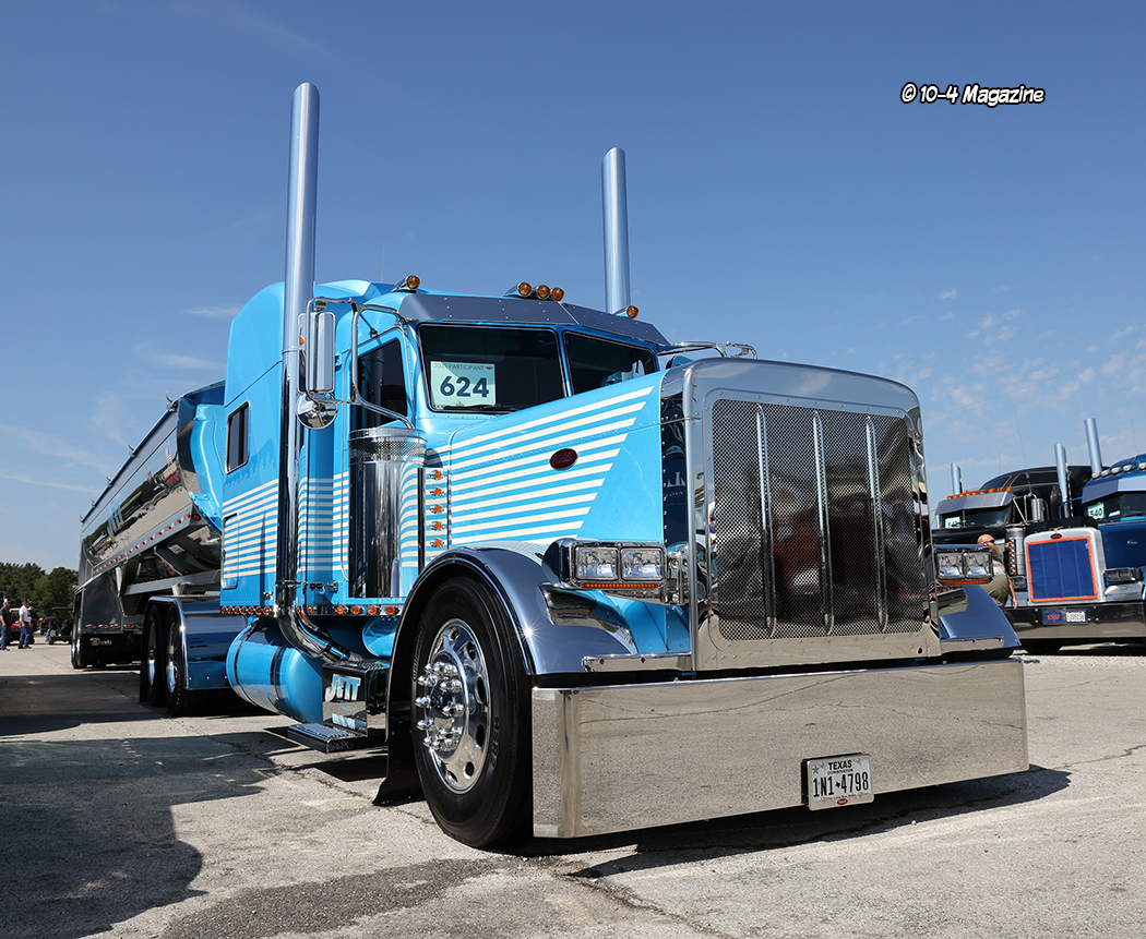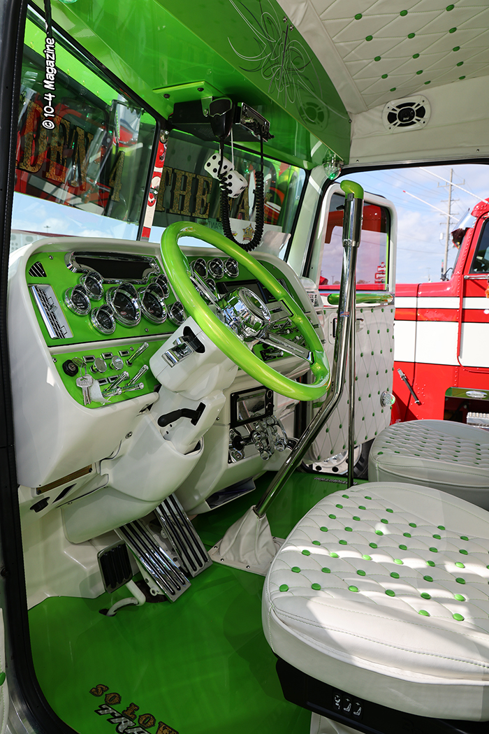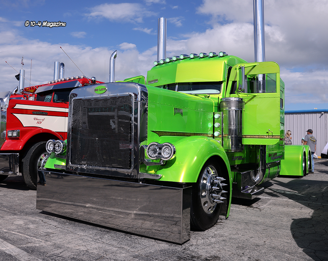 With over 750 trucks at the show, it would be hard to pick a few favorites without leaving some out, but here goes. The ones that stood out to me included Jett Transport’s baby blue with white stripes Peterbilt 379X and polished Travis end dump, a gray Freightliner COE with a matching Utility reefer from Texas, and So Low Transport’s iridescent lime green Peterbilt, with tons of custom unique features and a stellar white and green interior. A few other standouts included J&L Contracting’s new red and gray Peterbilt 389 service truck, Conrad Shada’s sly purple and black 379/389 Peterbilt, and a neat black ‘48 Peterbilt, complete with a highly polished 3408 CAT stuffed under the butterfly hood. The “Murder Pete” is always fun to see, too, especially around Halloween.