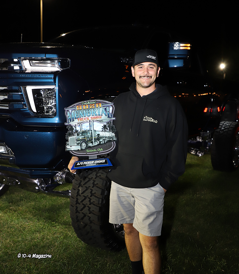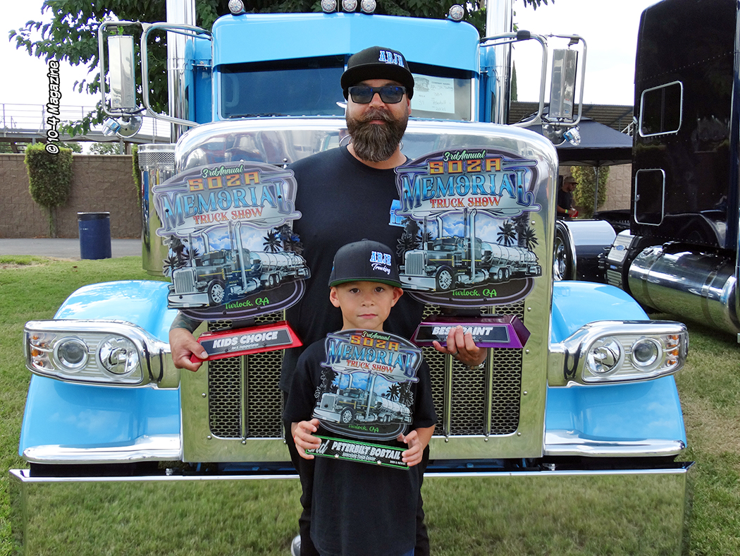 Despite light rain on Saturday morning, the weather was otherwise nice, and spectators came out regardless to see the trucks and enjoy the annual event.  At this year’s show, there were also 14 custom pickup trucks – some lifted and some lowered – competing in their own little competition on Saturday.  Dozens of raffle prizes were given away, as well, including a rolling toolbox, an NFL football signed by 49er’s George Kittle, a baseball signed by members of the San Francisco Giants, Yeti cups and coolers, all sorts of miscellaneous gift baskets and, of course, a lot of truck chrome.  Big thanks to Jeff Delacy for carving and donating yet another cool wooden truck.  This year’s truck was a 379 Peterbilt hooked to a step deck.  This is the third truck that Jeff has made and donated to the Soza truck show.