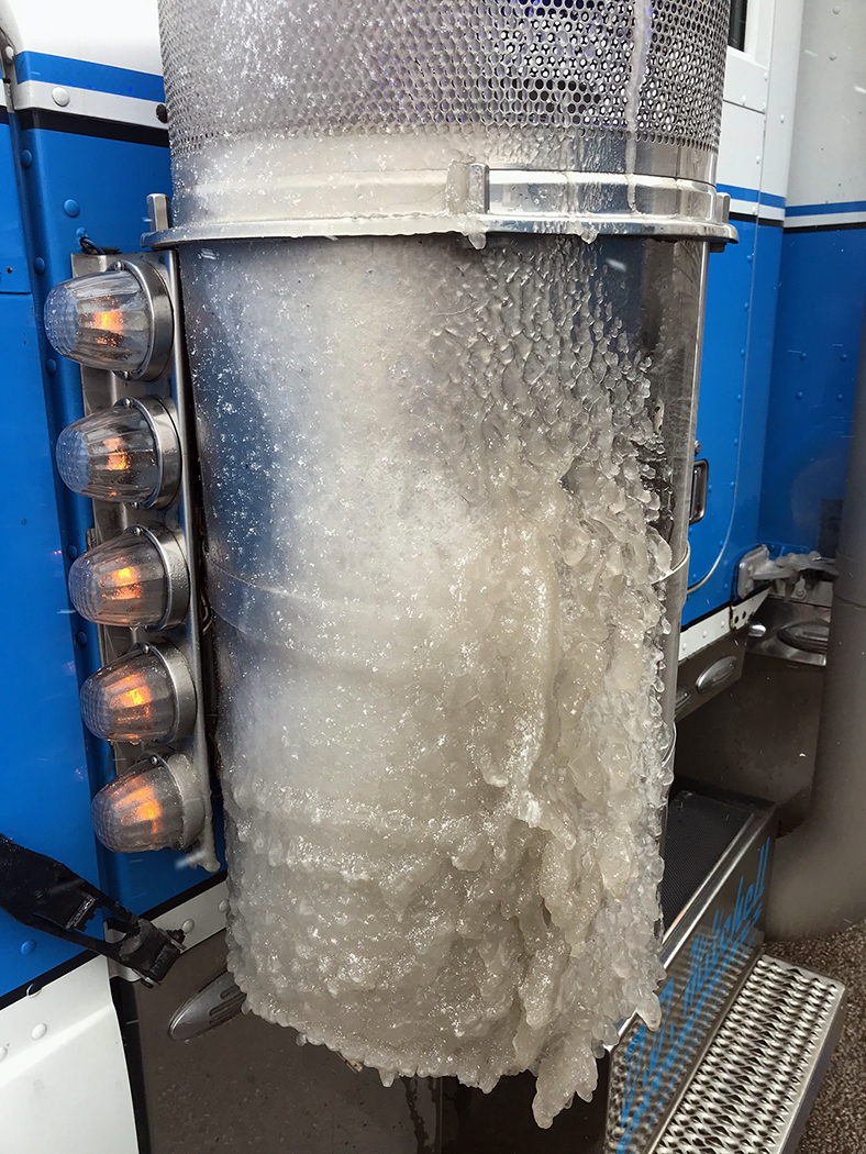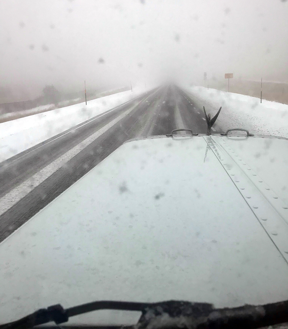 I pulled off the road at one of the exit ramps and was lucky enough to contact a base station operator who gave us directions around the back up. We mapped it out on the trusty paper road atlas just to be sure it was truck friendly. Maybe under normal conditions it would be fine, but in the fog, it was not so good. We committed to the road and pointed the truck towards the North Pole (and home), as I urged all 425 reindeer under my hood to start flying – if only we had a red-nosed Rudolph to lead the way. As we started to climb the hill, the rain turned to snow, and the road iced over quickly. Things went from bad to worse. Ice was collecting on the trees and the snow was building up to the point of bending them into the travel lanes.