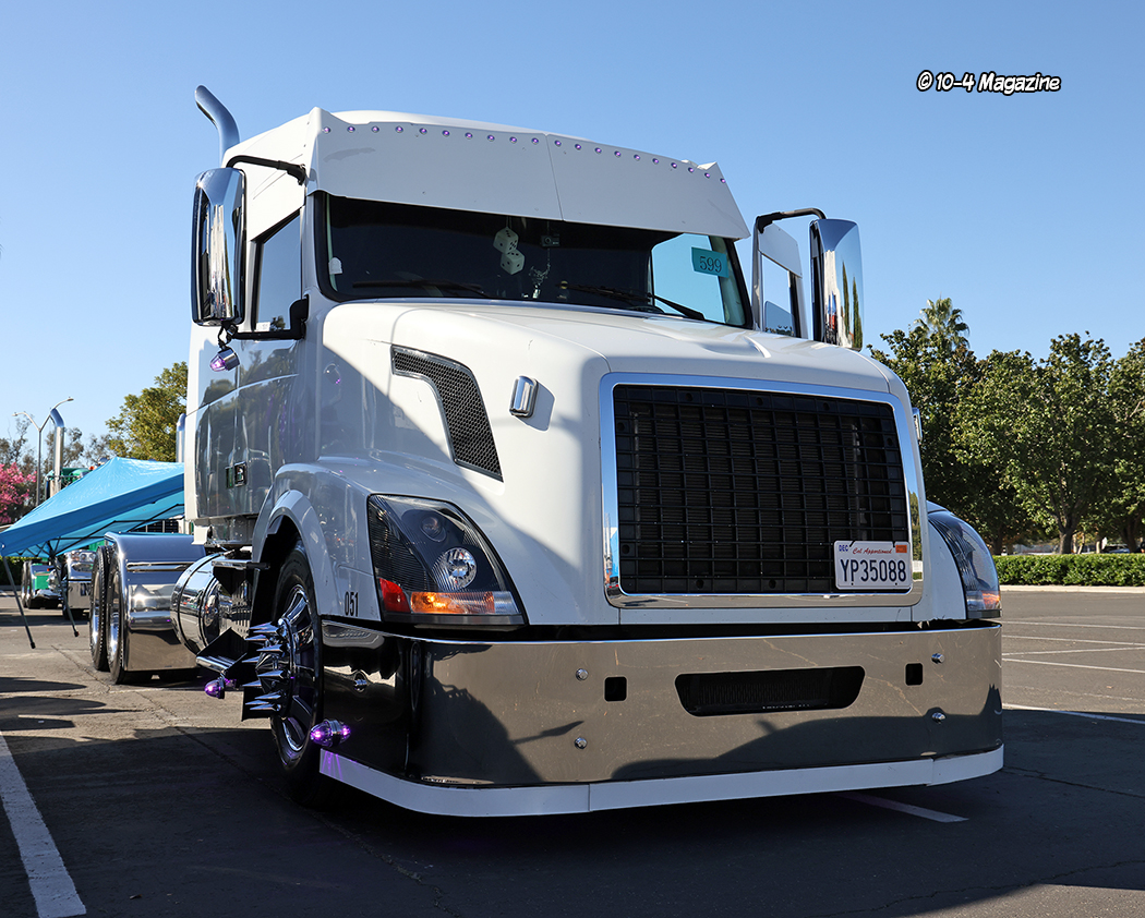 A few other noteworthy trucks out on the lot included Neri Diaz of Harbor Pride Logistics and his lineup of five brand-new, matching, green Pete 389X trucks, with sequential serial numbers, along with another green 389 – it was very impressive.  Our friends at Monzon & Son also had a few of their flamed rigs on site, along with Fonseca & Sons and their cream-colored 389 with black and gold stripes, a very cool black and purple Peterbilt 389 with “22G Trucking” on the side boxes, and even a really slick, painted white, lowered Volvo.  TMT Industries also had a nice two-tone blue Peterbilt out on the lot, as well, and there were so many others.