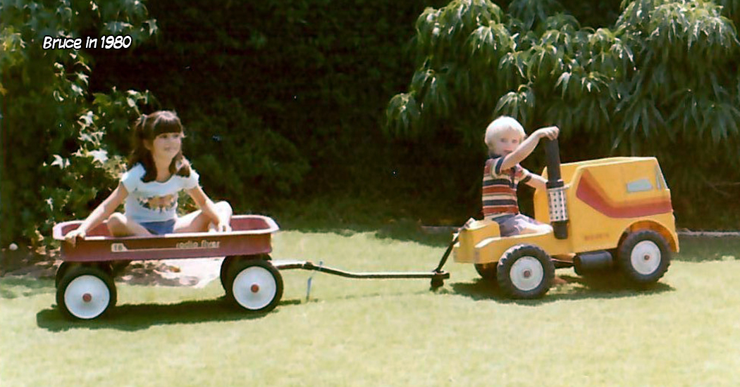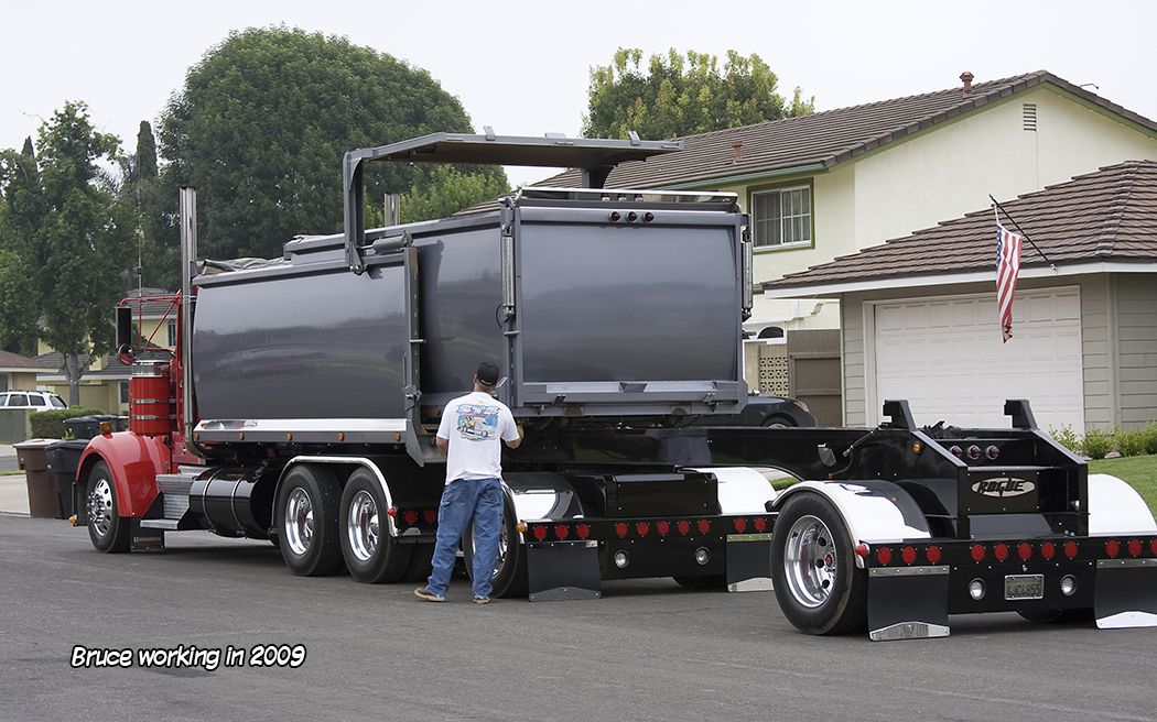 Starting with an old Kenworth transfer, that truck burned down while it was parked one night, so Bruce’s dad bought another Kenworth cab and chassis and then mounted the transfer equipment on it from the first truck, which had survived the fire. His dad used to joke that they now had one truck but two payments, because they were still paying for the first truck that burned! The following year, Bruce (the one featured here) was born in 1978 in Fullerton. Known as “Junior” by some, although he is not technically a Junior, Bruce spent the first ten years of his life in the city of Placentia, playing with trucks, with his dad and grandpa.