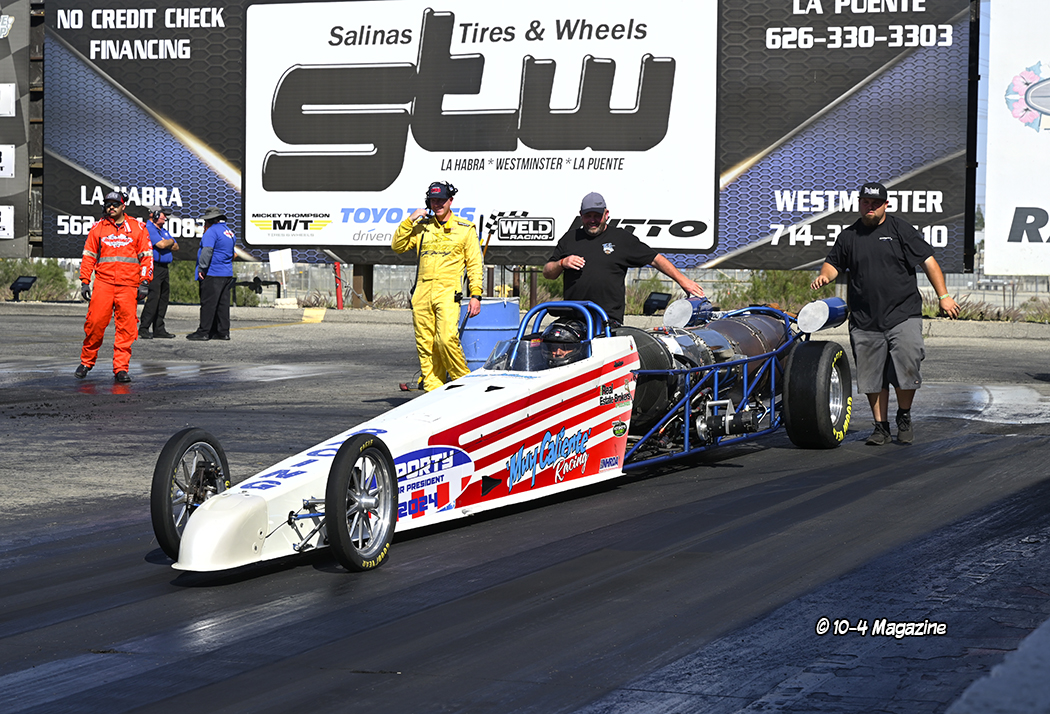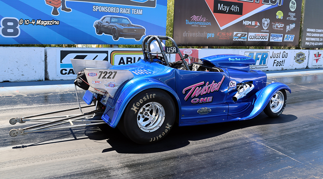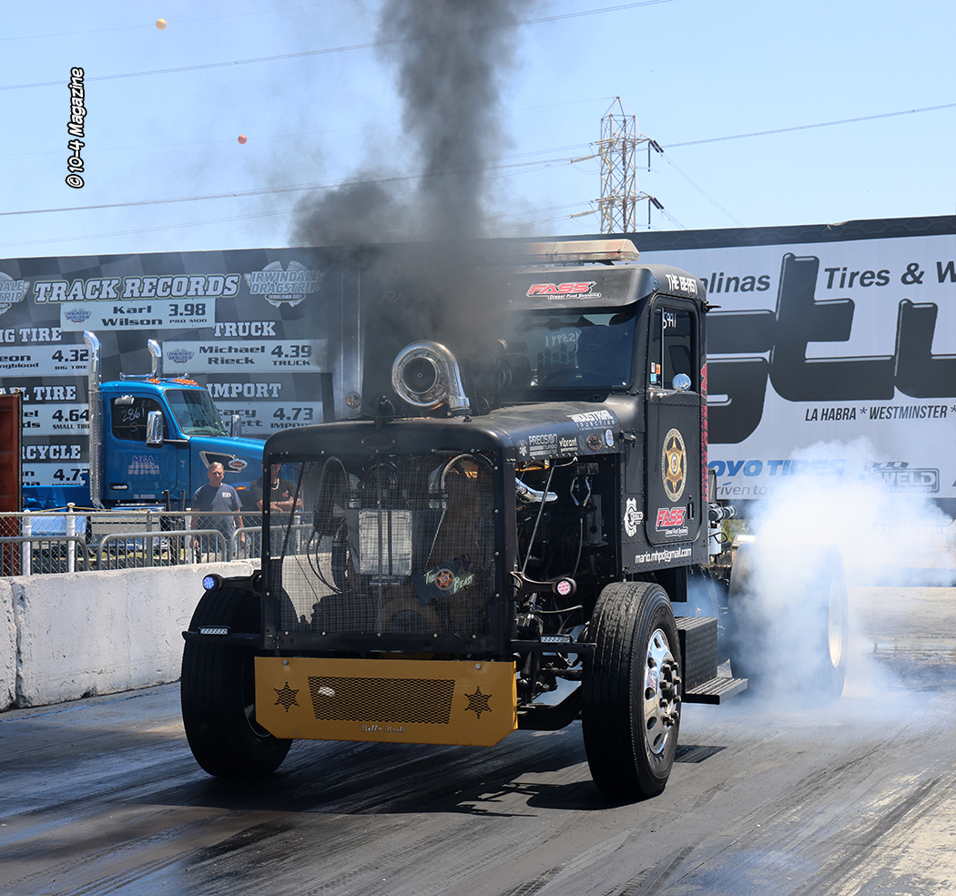 At noon, the track got loud and busy, as the drag racing portion of the event got underway.  Starting out with a tribute to Ray Valenzuela, a trucker and former TFK volunteer who recently passed away, his son and two grandkids did a “slow roll” down the drag strip in Ray’s gray and maroon Peterbilt 389.  After that, one of the jet dragsters from Tony Franco of Muy Caliente Racing did a blistering run down the track to get things kicked off.  With a few special cars making exhibition runs for the crowd, which practically filled the grandstands, we’d like to thank Kelly Anderson of Mavix Community Outreach for bringing out her orange Camaro, and John Minor of R.D. Reed Heavy Transport for bringing out their blue “Twisted One” hot rod coupe and making a few fast passes, as well.