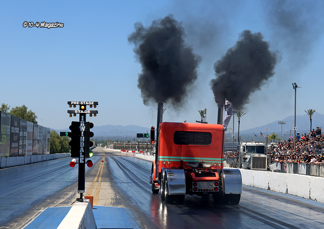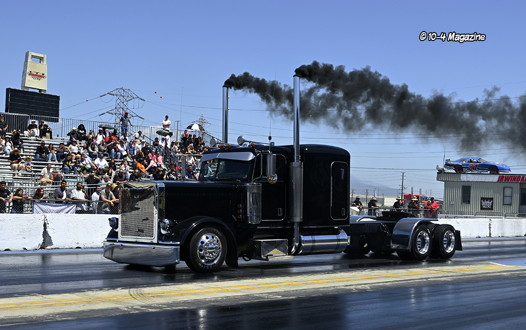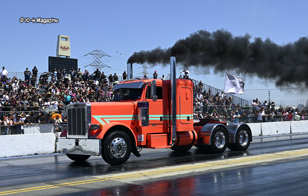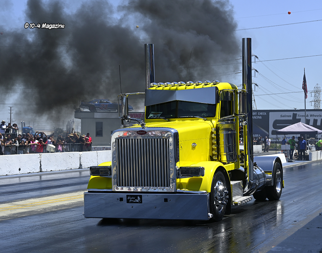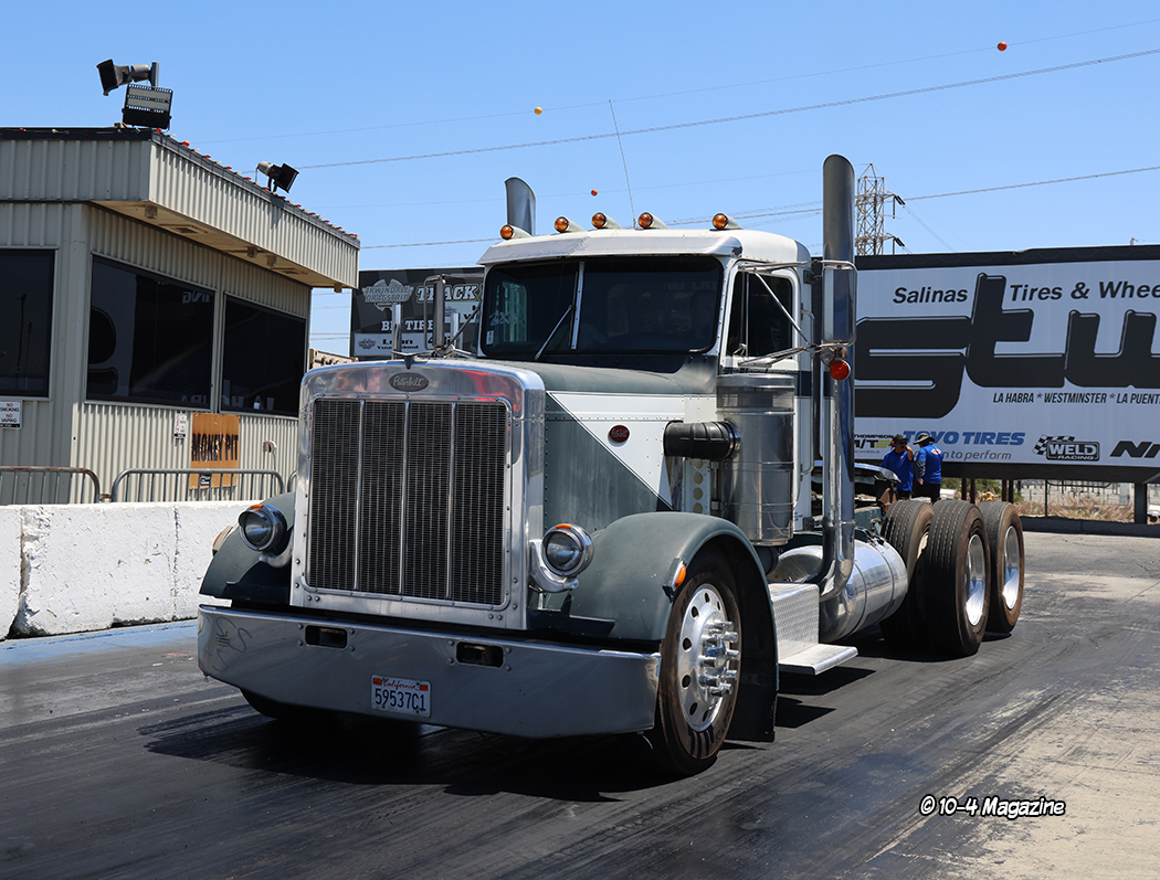 Some of the individual standout rigs for me included J.M. Mascaro’s mint green Peterbilt hooked to a livestock trailer, a red Kenworth W990 hooked to a matching reefer owned by Rollin R Enterprises, Cortez & Son Trucking’s white and baby blue Peterbilt hooked to a clean and polished Extreme flatbed, and AMT Express and their maroon Kenworth T660 hooked to a stepdeck.  Daniel Moya of YMD Material brought out his new 2024 Peterbilt 389 transfer, painted peach and gray, which really stood out, and our friend and past cover trucker James Gasper brought out his black 2022 Peterbilt 389 that not only looked good sitting still but ran down the track at a rather impressive pace, as well.