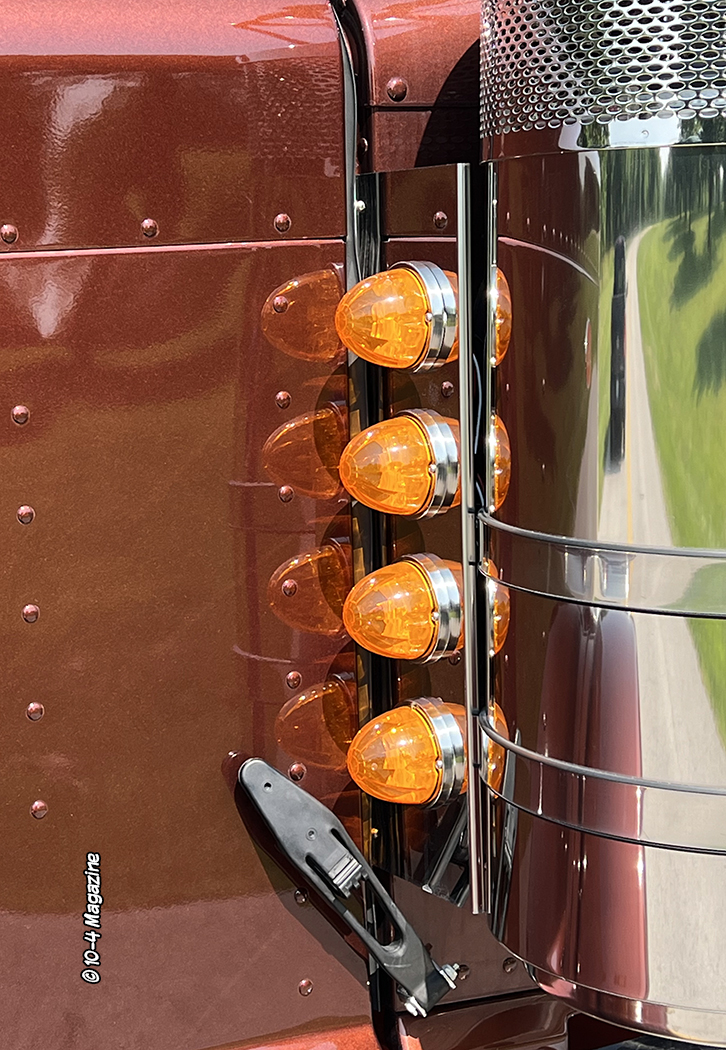 Last year, Jesus was able to get on the list and get one of the last 389s built. The truck is a 2024 Peterbilt 389 extended hood with a 36” sleeper, an X15 Cummins, an 18-speed, and all the goodies. Painted in his company’s brown color with an orange frame, Lilly was in charge of the main build on this one, with some help from Cody, for the seven cab lights and breather lights that strobe. She also added a stainless drop visor, hid the DEF tank, and installed 7” full function stacks. I added a temporary mudflap bracket before it headed to their friend Charlie with Unlimited Metal in Yuma, AZ to get ramps, rear fenders, and some other final touches.