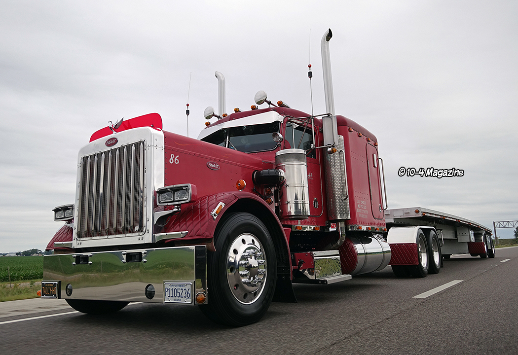 As mentioned previously, the pictured pair of rigs are both 1986 Peterbilt 359s. Dalton’s truck (all red) boasts a 400 CAT with an 18-speed transmission, 3.70 rears, a 278” wheelbase, and can be found hooked to a 2006 Benson 48-foot flatbed trailer. Chris’ truck (red with black fenders) is powered by a CAT C-15 with an 18-speed transmission, 3.55 rears, a 312” wheelbase, and is usually hooked to his nice 2020 MAC 48-foot flatbed trailer with a Quick Draw tarp system.