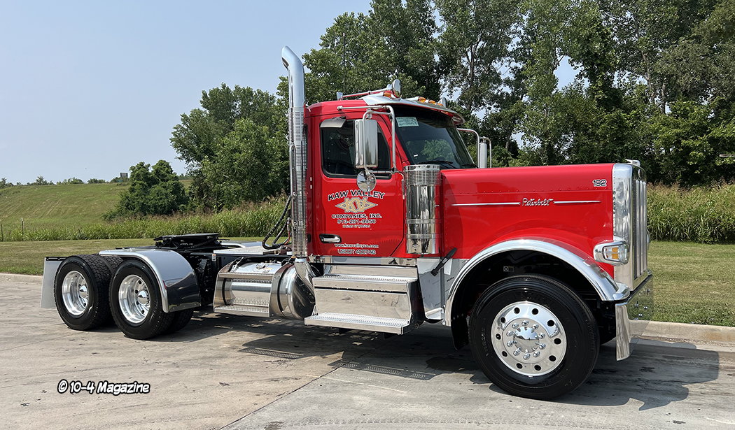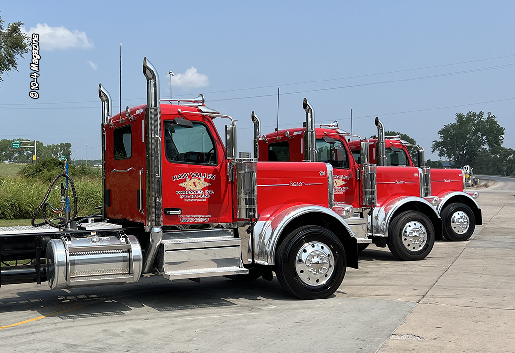 When it was time to update a few of their 2018 extended hood 389 day cabs, Kaw Valley ordered some of the new model 589s, opting for the Legendary package, and special factory options similar to the Pride and Class package from the 389 days. These come with special script writing in place of the standard oval logos, along with stainless cab and cowl panels, and special seats. Painted in their corporate red color and powered with X15 Cummins engines, they decided to try something new and opted for Eaton/Cummins Endurant XD Pro 18-speeds.