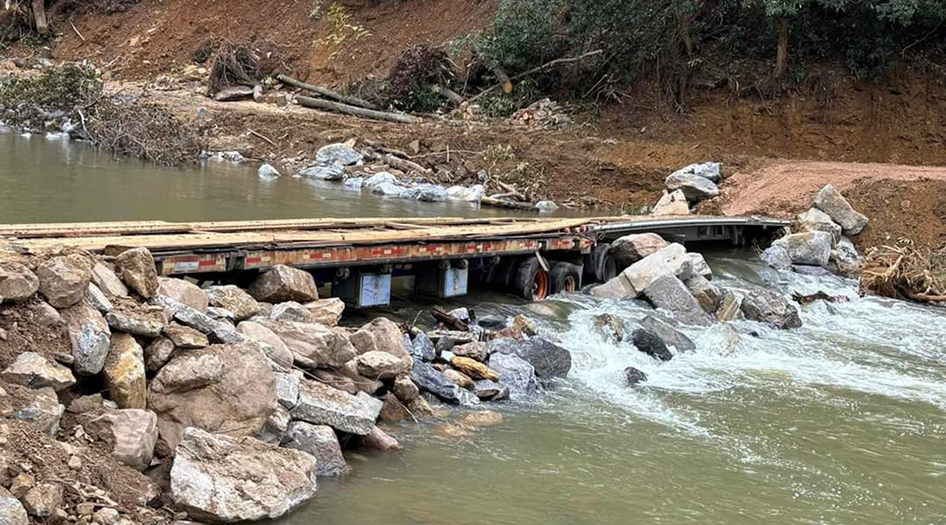 The damage that resulted from the deluge of water and wind from Helene will take years to rebuild.  It is going to take heavy equipment to take apart and clean up what is left of a lifetime of work and memories for so many in these mountains, along with dump trucks and trailers to haul it all away.  Bridges in many areas of the mountains were washed out leaving no way in or out for many people.  Helicopters, ATVs, boats and even pack mules were the only way to get supplies to people who desperately needed them.  In one place, they used ingenuity and two flatbed trailers to build a temporary bridge to get supplies to people who had no other access.