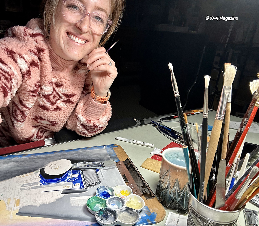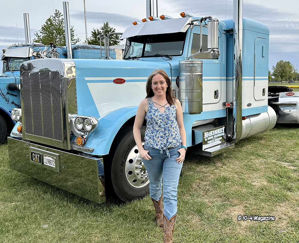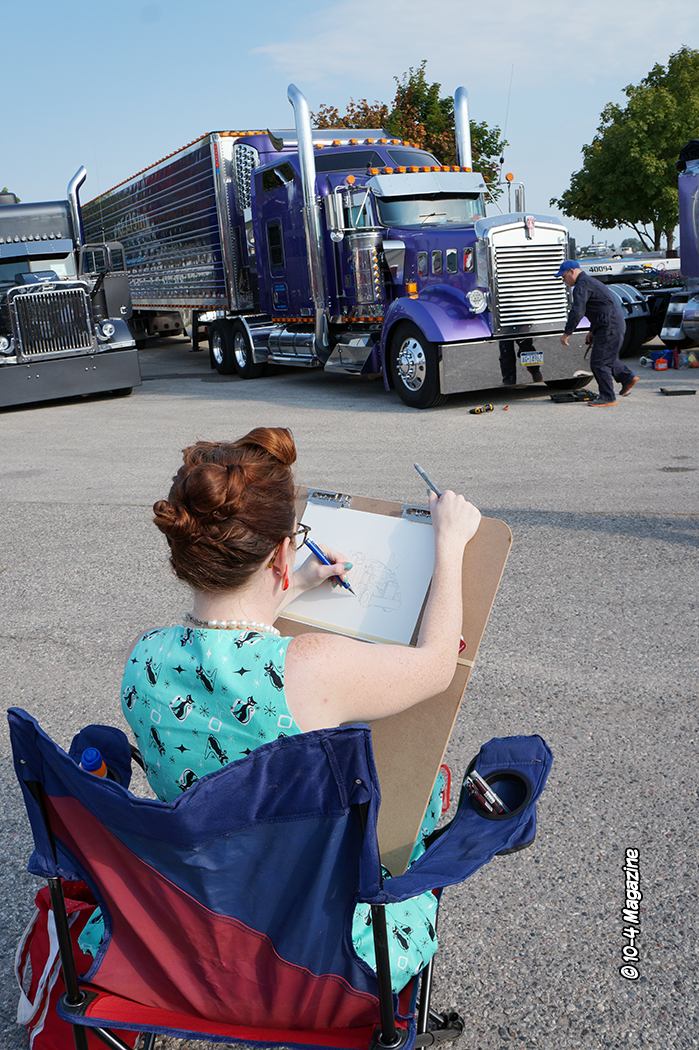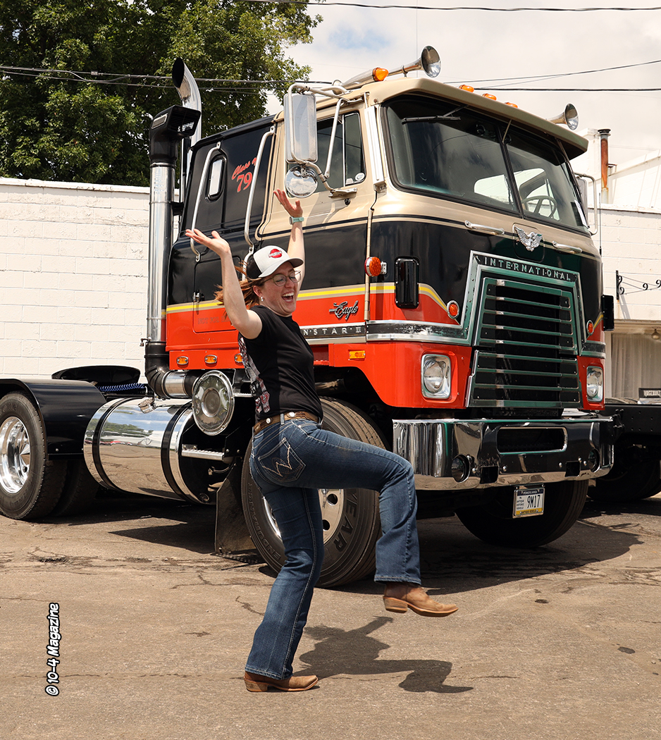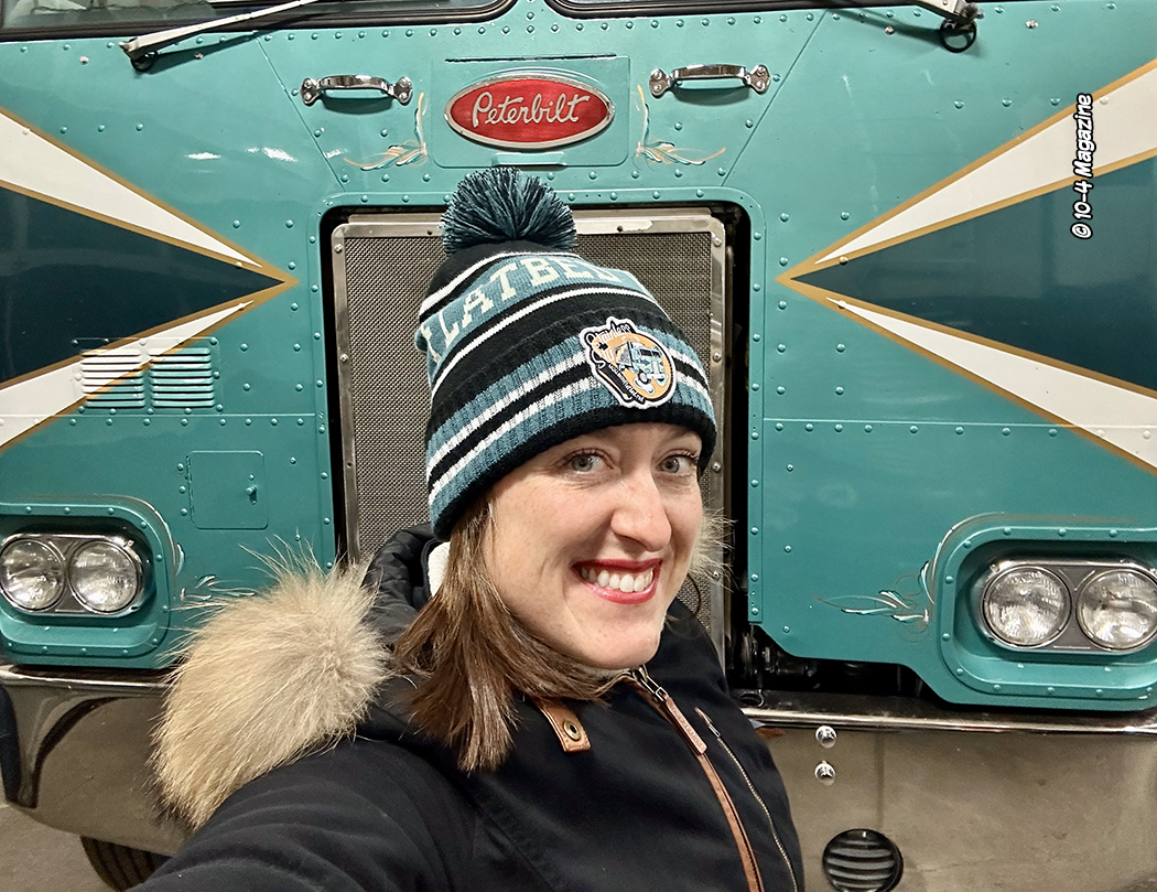 The red hair, the big smile, the videos, and of course the amazing truck art – these are just some of the things that encompass the woman that is Miss Flatbed Red. This 35-year-old gal resides in Findlay, OH, a thoroughfare for many trucks to pass through, and a location that keeps her fairly close to most of the vintage ATHS shows she attends. Whether by plane, car, or in her single axle 1980 Peterbilt 352 factory box truck, you can find her wandering the grounds at a show. Like some of us, she doesn’t come from a trucking background, and like artists of every style, she started out doing portrait and pet drawings, which is something she had done since forever. She studied music in college, but was drawing throughout that time, so much so that her music teacher even said she should be an artist. In search of her niche in drawing, everything changed when she drew that first truck – and she hasn’t looked back since. Some may wonder how this young lady came up with the handle “Miss Flatbed Red” – it was a week or two process, searching for a website domain that would incorporate an old school pinup style vibe. The closest to any truckers in her family was her father who, after retiring from the police department, obtained his Class B CDL and drove a box truck for a few years. Even though she didn’t need a CDL to operate her historically plated 352, she obtained her CDL in November 2022. Flatbed Red has been married to her husband Chris since 2016 and together they have three cats, including one named Transtar Rose, because she dreamed of having a model 4070B or 4300, but got a cat instead. As she humorously stated, “My jobs are people’s hobbies,” which includes piano lessons and teaching couples how to dance. All her artwork is commissioned, and she used to draw at shows, completing each piece in roughly two hours. This gal came into contact with our very own John Testa at the 2019 ATHS National Convention in Reno, NV but was unable to speak for an interview because she had lost her voice. There was an article done on her by Kim Jaikes in March 2020 where Flatbed Red also submitted some images to accompany the article. That was just the beginning of contributions, as she has contributed every month since April 2020 in her feature “Red’s Rides” where she showcases some of her completed truck art. Her favorite type of truck shows are the ones without any awards because the atmosphere is calm and relaxed. In her eyes (and many others), truck people are the best people. When asked about her involvement in the magazine, she said, “It’s really frickin’ cool! It feels really special to be a part of something as big at 10-4 Magazine.” She enjoys being able to refer people to the magazine. We appreciate you Miss Flatbed Red and we are happy you are part of the 10-4 family! Thank you for the amazing artwork you contribute to our beloved magazine every month!