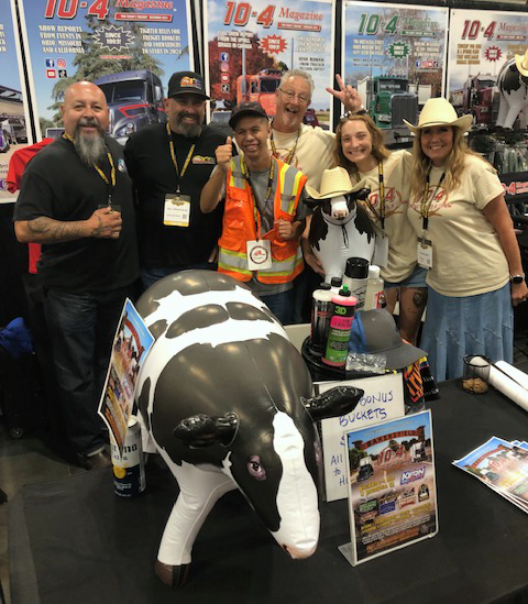 Helping us out in the booth this year (Dan and Shannon) were Polly Kasper (Shannon’s mom), our son Parker, and our daughter Paige and her boyfriend Kenan.  Between handing out magazines and rolling posters, talking to attendees and fellow vendors, taking pictures both inside and out, and selling swag, we were very busy all weekend.  Bringing out our brand new “Legendary II” shirt, which features Ron Kelsey’s orange Peterbilt 359 which he has been driving for over 30 years and has been on our cover twice, this shirt was a big hit.  We also handed out hundreds of free copies of 10-4 Magazine, along with centerfolds and posters, and ran out of everything on Sunday afternoon – even after bringing in some extras on Sunday.