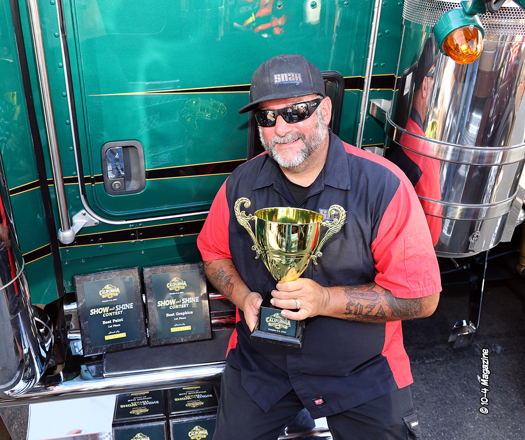 Outside in the heat, our friend and past cover trucker (January 2007) Frank Alarid was tasked with being the sole judge at the show – and he did a thorough job of analyzing these rigs.  Doing it by himself was not easy, but he was a good and fair judge, and he did great!  Once again, we sponsored the People’s Choice award, and once again, Carl Carstens at Rockwood Products built us an amazing trophy to hand out.  Before heading out to the awards, our friend Brandon Chase and his father came by the booth to talk, hang out, and take pictures with us.  This “kid” is the biggest truck fan you will ever meet, and his dad is a really special human, too.  Thanks to Brandon’s dad for taking the picture of a bunch of us with Brandon in our booth and then sending it to me after the show.
