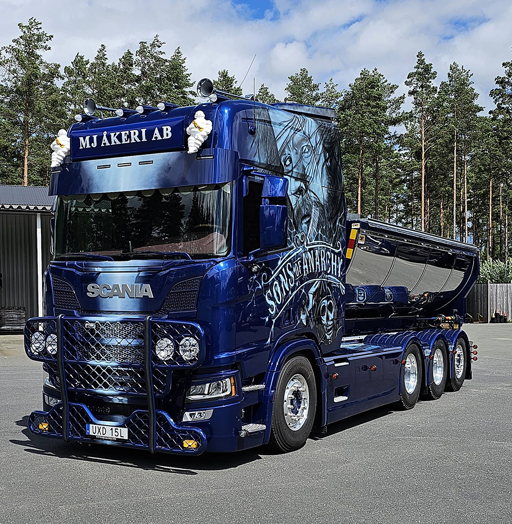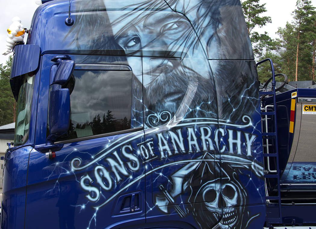 After initially considering a cowboy theme, a friend suggested that the new Scania R660, operated by Linus Jalonen (24), should be painted as a tribute to his favorite TV series, “Sons of Anarchy.” Linus thought it was a good idea, because he wanted his first truck to stand out and not look like any other. In early April last year (2024), Linus picked up his Sons of Anarchy-themed Scania from the paint shop, DR Lack, where airbrush artist Dr. H, Hakan Andersson, had just completed the final touches. And the results exceeded his expectations.