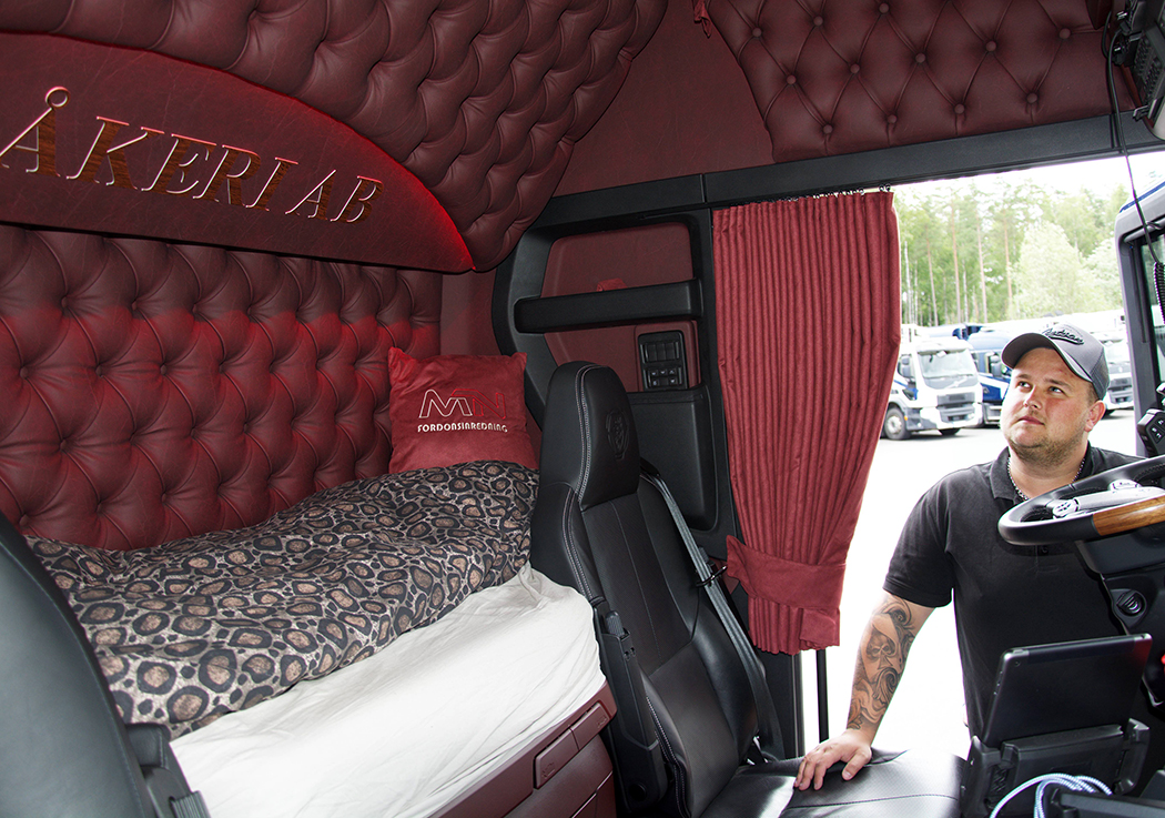 Going to work at the company right after high school, there was never any question about Linus pursuing a different career. “I’ve been riding in the trucks my whole life,” Linus said. Before putting the new Scania to work, it needed a custom paint job and a cool interior. The truck is a 2023 Scania R660 with a 660-hp V8 engine and a Hiab 24-ton self-loading crane. The truck’s cab and sleeper have been luxuriously outfitted with button-tufted burgundy leather on the ceiling and side panels.