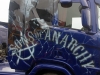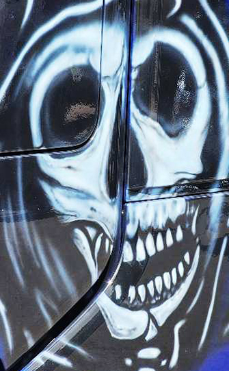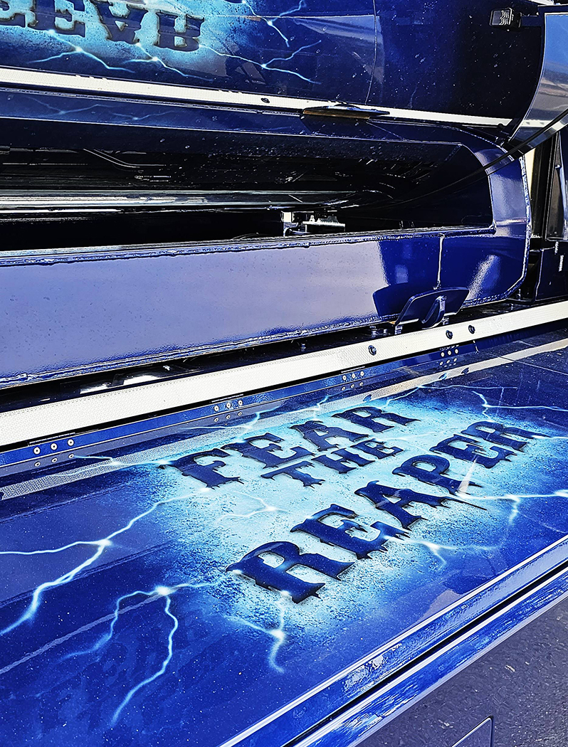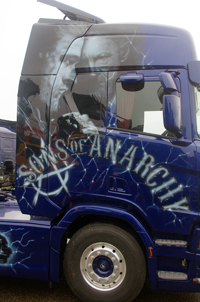 On the outside, fans of the show “Sons of Anarchy” will recognize seven of the main characters from the series about an outlaw motorcycle club in the fictional town of Charming, California, along with the club’s patch featuring The Grim Reaper. Linus admits he hasn’t seen all the episodes of the show, but Dr. H (the painter) has watched them several times, so he was particularly excited to paint Linus’ Scania with scenes from one of his favorite television shows.