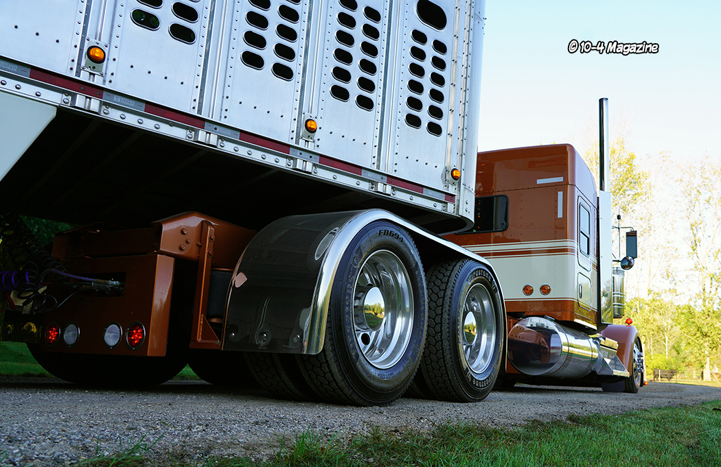 Eric’s truck is a 2021 Kenworth W900L with a Cummins X15, 18-speed transmission, 292-inch wheelbase, 3.36 rears, and can be found hooked to a 2016 Wilson livestock trailer. The truck sports a stainless American Eagle bumper, factory stacks with Dynaflex tops, Sutherland Bros. air ride, and Hogebuilt stainless full fenders.