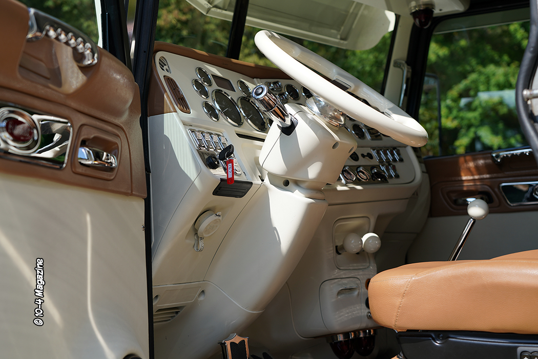 Jeremy’s truck is a 2018 Peterbilt 389 powered by a 550 Caterpillar 2WS, 13-speed transmission, 3.55 rears, and a 300-inch wheelbase. This classy truck has a Lincoln Chrome bumper, 12 Ga. Customs visor (as well as light bars and deckplate), Dynaflex 8-inch stacks, Shift Products fenders, and the interior was done by Davis Bros., with a nice stereo install by Kevin Johnson. I saw Jeremy’s truck for the first time in September 2018 at the Richard Crane Memorial Truck Show in St. Ignace, MI where I was able to capture some cool shots of the truck with the Mackinac Bridge.