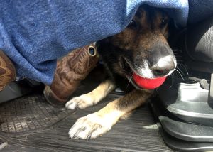 I don’t want to bother my driver by asking him to retrieve my ball as he is quite frustrated at the moment that traffic has only moved ten feet in the past twenty minutes. I’ll just grab it quickly so as to not upset him further. I’m positive I can silently slink up front and grab my ball from under the pedals, unseen, and then retreat in ninja-like fashion, but then a cacophony of four-wheeler horns blare all at once and my driver slams the middle pedal down hard, narrowly missing my snout. The loud popping sound coming from the truck is ear-splitting, and the truck lurches to a sudden stop as both of us are violently flung to the side.