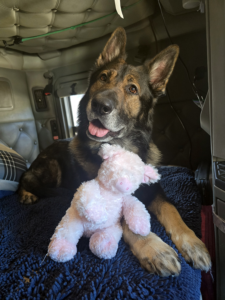 Here in Chicago and yesterday in St. Louis, I decided to retire to my bunk because sitting with my head out the window with the constant start and stop, hard braking and stress could cause me to barf my breakfast all over the truck’s floor. I don’t want to add to the already ever-present colorful language put out by my driver this evening by vomiting semi digested dog food on his hand and shifter knob like I did in Los Angeles last month. Upon reflection, I don’t think I want to be, what did he say, “Secured to the catwalk with grade 80 chains and binders until my muzzle turns gray?” That threat did sound extremely ominous at the time, so earlier I decided to wait out this traffic and spend my city time (plush piggy in mouth) back in the bunk for some peace.