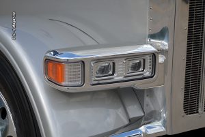Once the truck arrived, Mike was given the task of dialing it in. Storm made me a special stainless drop visor, which to date is my favorite one so far. Didie wanted special lights, so he ordered some sweet tanker lights from Jim’s Custom Iron Works in Narvon, PA. Mike installed two of these lights on the new Texas bumper, three on each side of the 12 Ga. breather panels, and two on the new lowered mirror arms Storm built at the Built by Bub weld shop. Mike added additional Rockwood grill bars, steer axle dump valves, 6” dummy pipes with my dad’s clamps, and chrome oilers on painted front hubs. The paint crew sprayed the fuel tanks, DEF cover, cab exhaust covers, all the brackets and pieces, and installed five load lights in the back of sleeper. Wanting to stay on a budget, we opted for a set of full stainless fenders and brackets from Class Eight Manufacturing. Lastly, our guys in service installed a wet kit for his end dump trailer.
