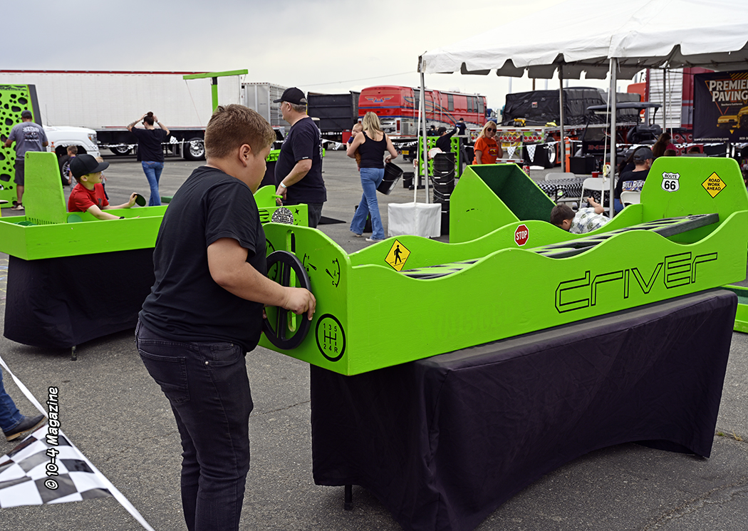 Our Kid’s Zone was expanded this year, too.  In addition to all the fun bright green games we bring each year and a larger tent for shade, our friend and past cover trucker Ron Ver Steeg brought out four little kiddie rides, and these things were a huge hit.  Like what you used to see outside of the grocery stores years ago, these little rides were a boat, a race car, a truck and a dinosaur, and they didn’t cost a thing – just push a button and away you went.  And these old rides were tough enough to accommodate both young children and adults who are still young at heart to get on them.  Next year, we will have even more of these fun little kiddie rides, including a 10-4 truck, according to Ron.