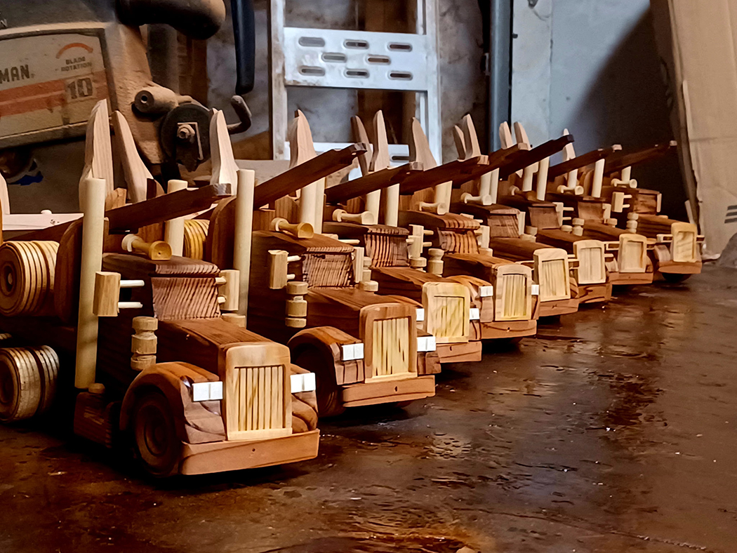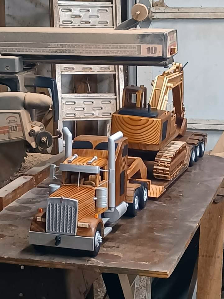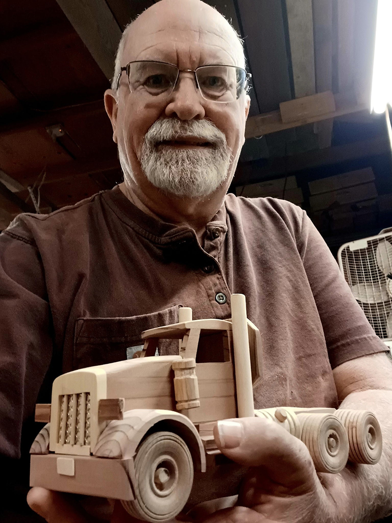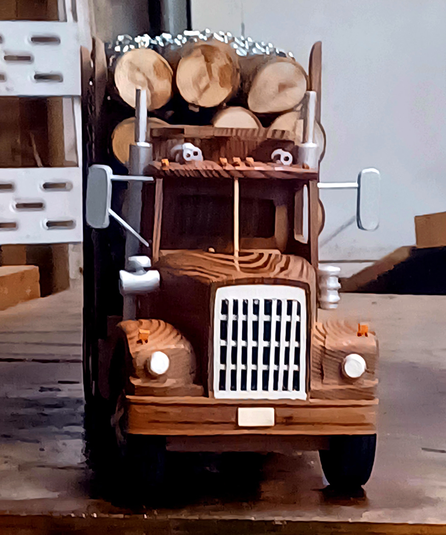 After his third wife passed away from cancer his truck building expanded. In December 2018, he built 33 small trucks, and gave them all away as gifts. One of the little boys he gave a truck to told him his father drove a log truck, and he asked Randy if he could build the truck he drives – a Kenworth W900. Randy said, “Sure,” and the big truck division of Randy’s Custom Rigs was born. Using golf tees for air horns, he buys the wheels, so they are perfect every time. He makes the trailers and some of the heavy equipment that sits on them, too, like dozers, loaders, backhoes, and the machines that load the logs onto the trailers, he has built them all.