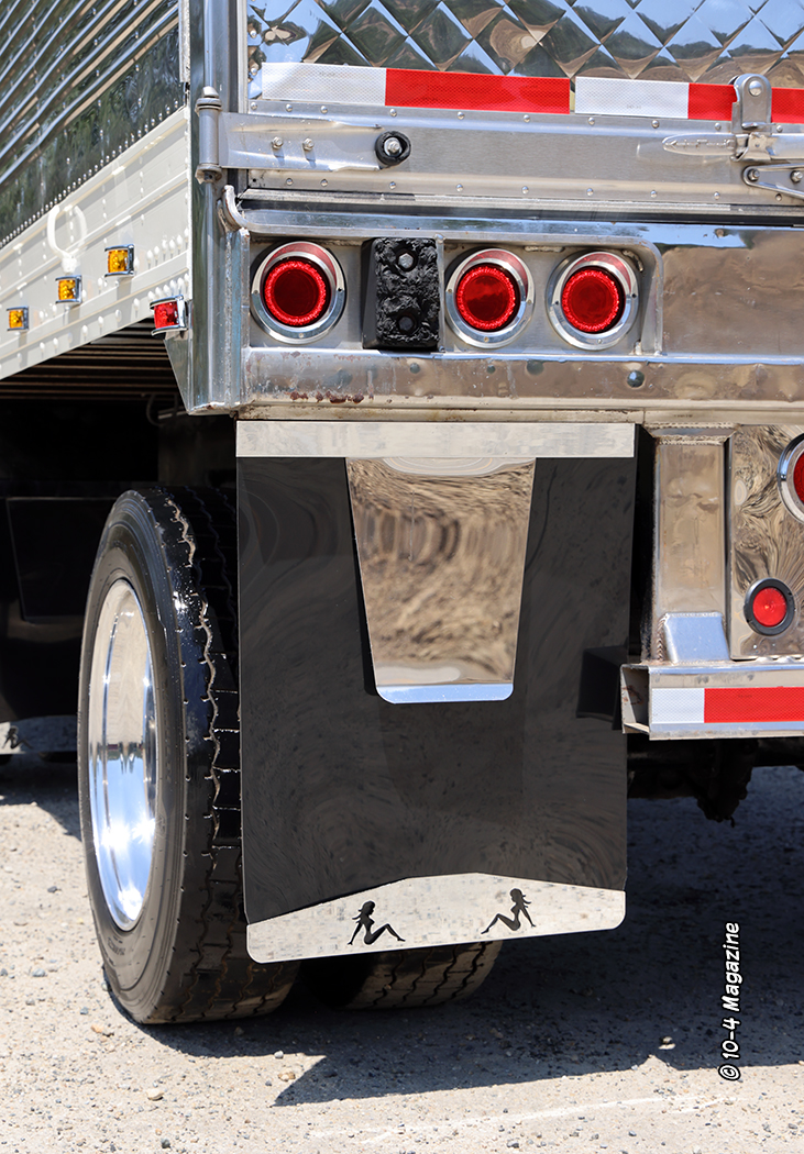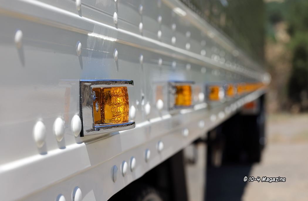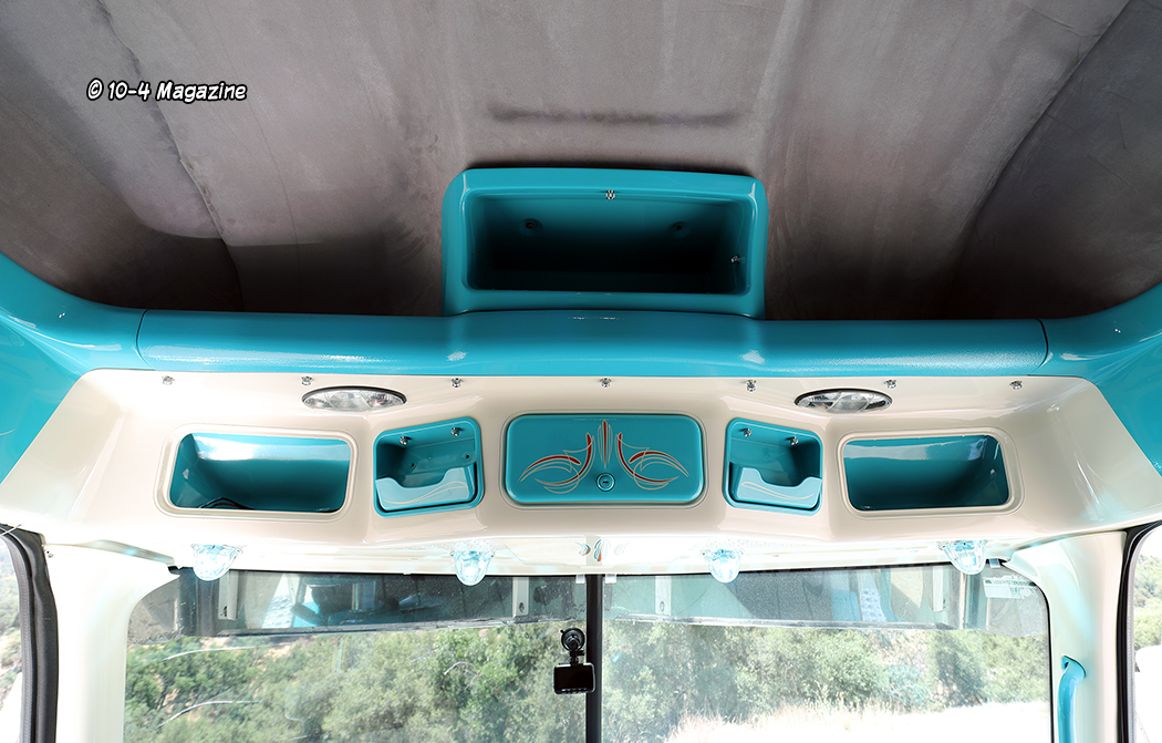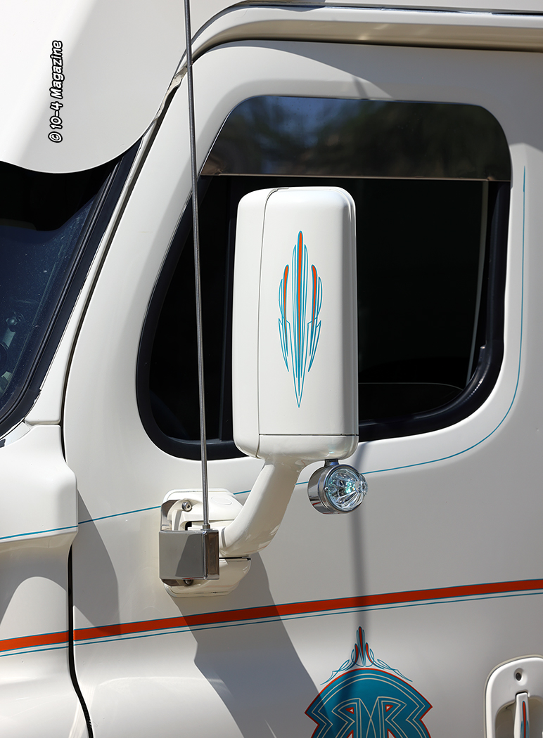 What really sets this rig apart from the rest is the interior, the lighting, and the pinstriping.  Dan from Farmersville did an extensive amount of orange and teal pinstriping, and also painted the company logos on the doors, which were designed by Rene.  All the watermelon lights on the truck are dual revolution with clear lenses, and Rene was able to find some unique colors I had never seen before – a different shade of orange and a cyan blue – which both match the truck perfectly.  The visor was on the truck when they got it, and it already had “penny” lights on it, so they just decided to paint the visor and leave the lights that were there.  Under the truck, the brothers added a curved tip to the weed-burner exhaust that was already down there.
