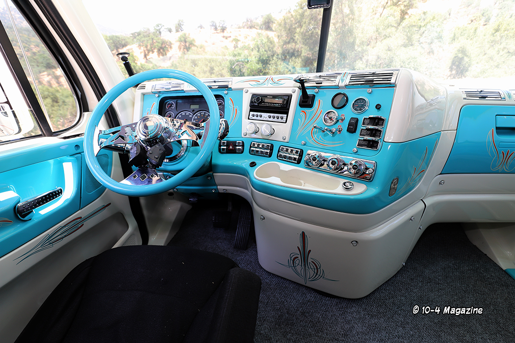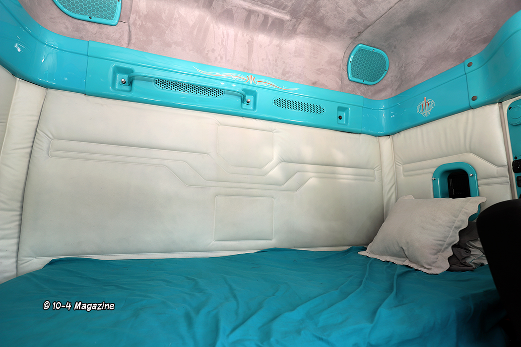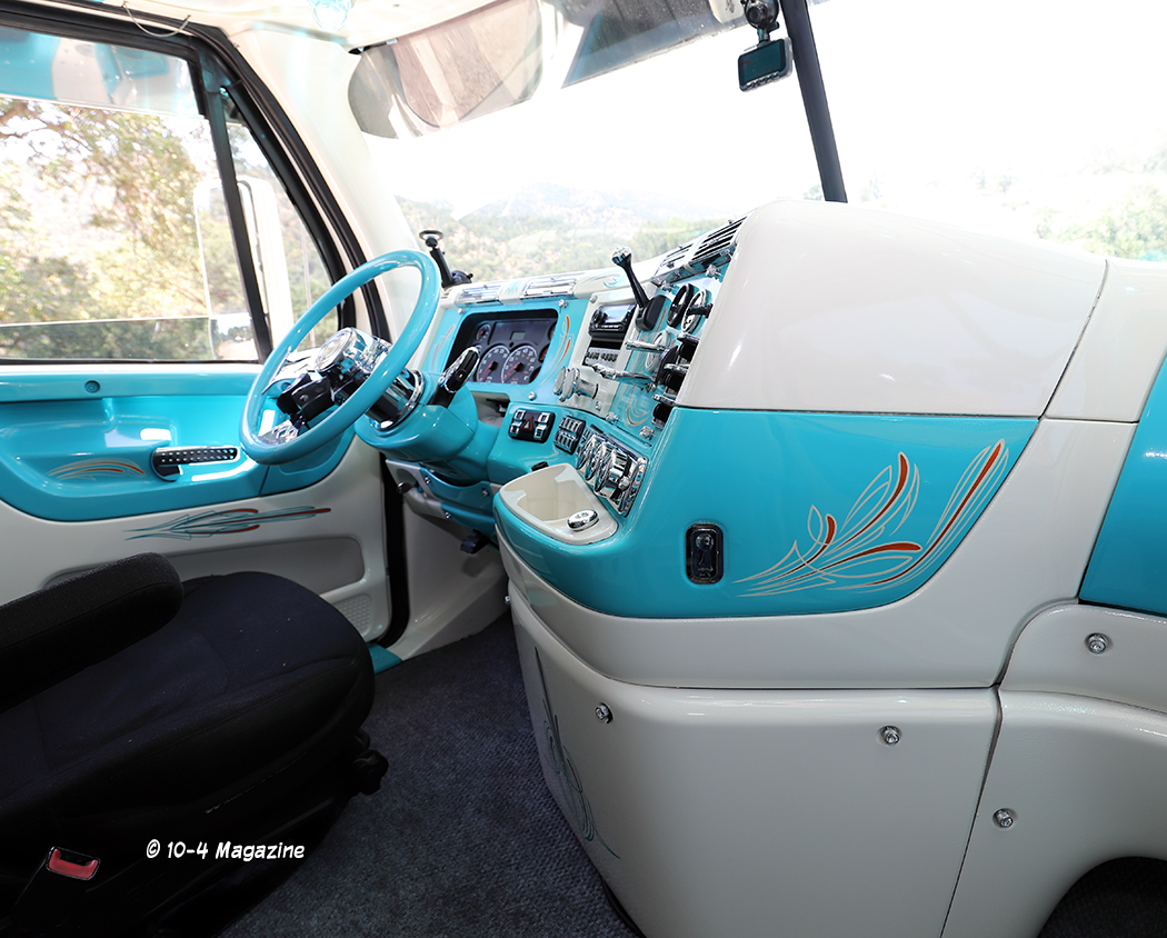 As mentioned before, the interior of this Freightliner has been completely re-done.  Smoothing out all the dash and door panels and painting them cream or teal was a huge job, but it turned out nice.  All the screws holding those panels were replaced with jewel-tipped fasteners, the heat and A/C controls and air vents were replaced with chrome versions, along with all the switches and gauges, a “trucker girl” steering wheel was painted to match and installed, and polished billet door handles took the place of the stock ones.  All the gray interior pieces back in the sleeper were dyed cream, the headliner was done in suede, the passenger seat was removed, and there is carpet on the floor (for now).  There are also plenty of dual revolution lights inside, along with a ton of pinstriping, too.