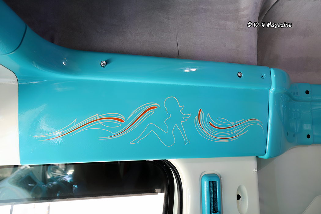 Although the truck was not completed, they had enough of it finished to take to that show in Mendota and ended up getting the People’s Choice award – they were shocked – and super excited!  This excitement fueled their enthusiasm and energy to keep going on the truck and helped them make the decision to buy another one and build a sister truck to this one.  And, seriously, this twin truck is just as cool as this one, if not cooler.  It looks exactly the same, except the teal and orange accents have been completely reversed, meaning the second truck is also cream but it has orange wherever there is teal on the first truck, and teal wherever there is orange on the other truck.  They also built this one on a budget and in just a few weeks, too.