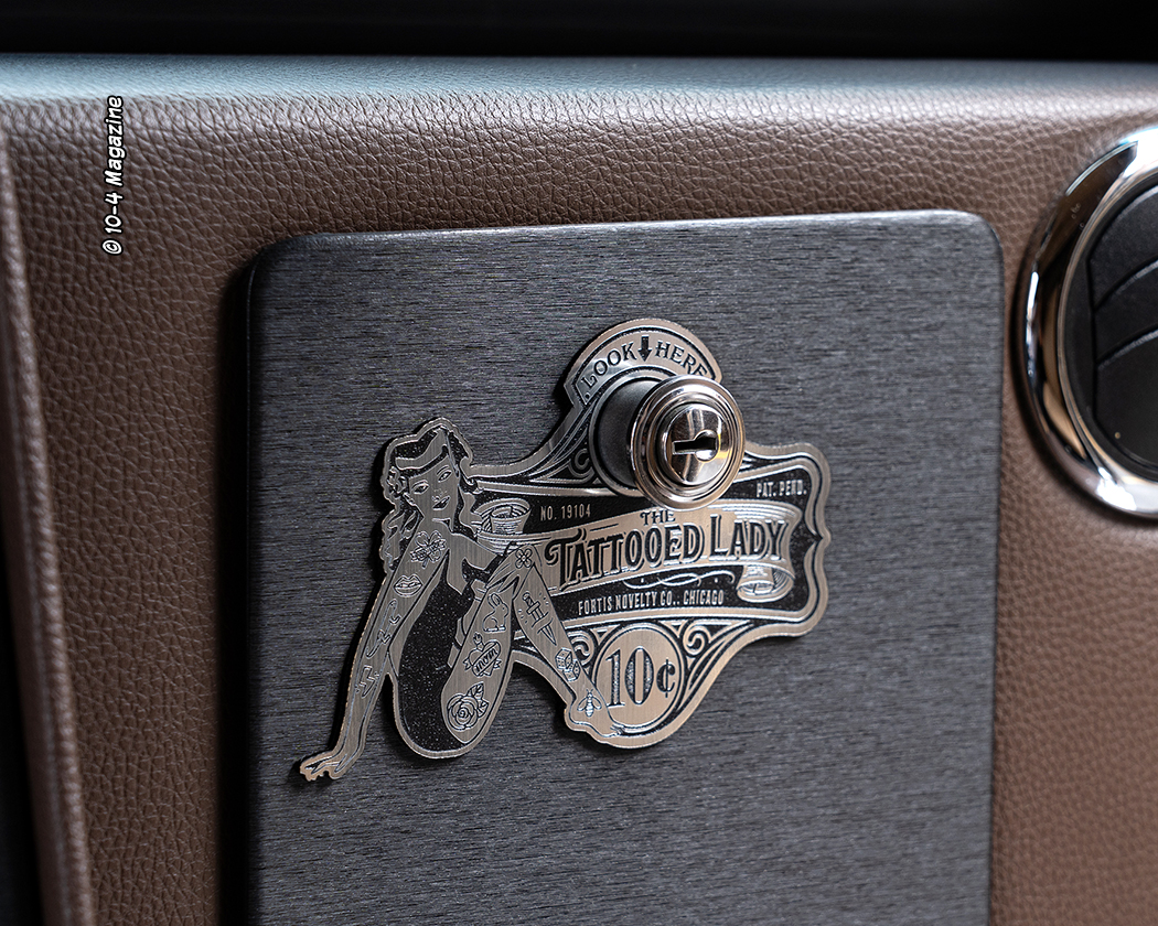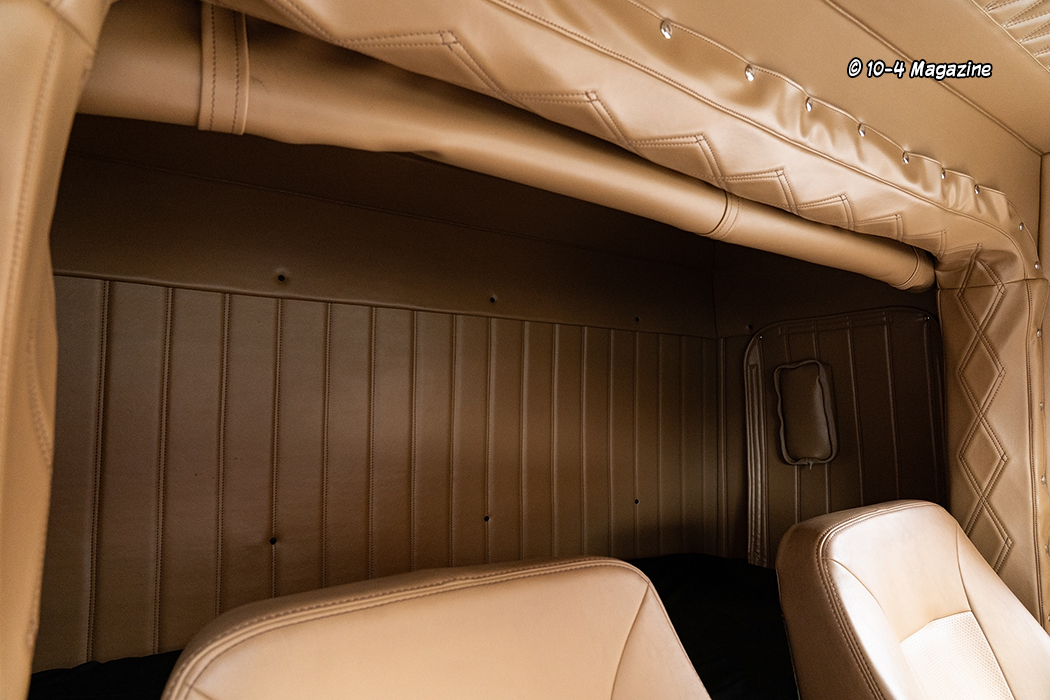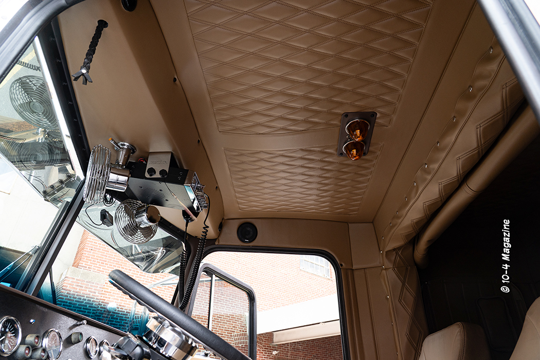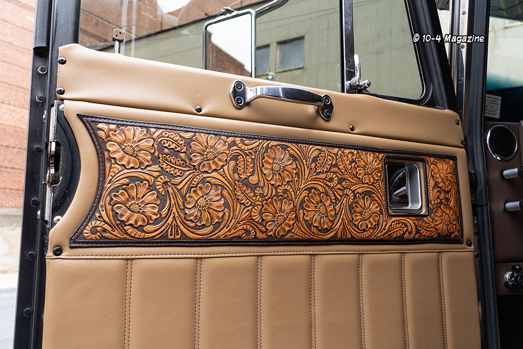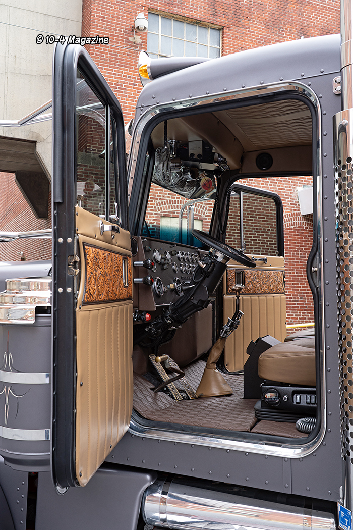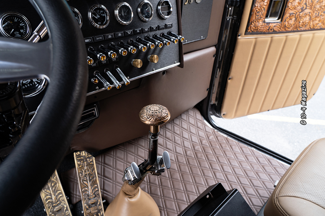 Moving to the interior of the truck, you might notice the unique dash first. “I completely custom built the dash in my shop at home to change the look of the interior,” explained Rick. He also relocated some of the switches and even the tractor and trailer air supply. The rest of the interior was done by Truck’N Awesome – they had someone hand-tool leather panels on each door, giving the truck a cool southwestern vibe inside. The driver and passenger seat are from Knoedler Manufacturing. The clutch, brake and throttle pedals are all unique, as well as the shifter knob.