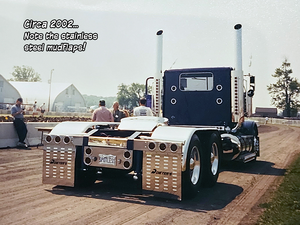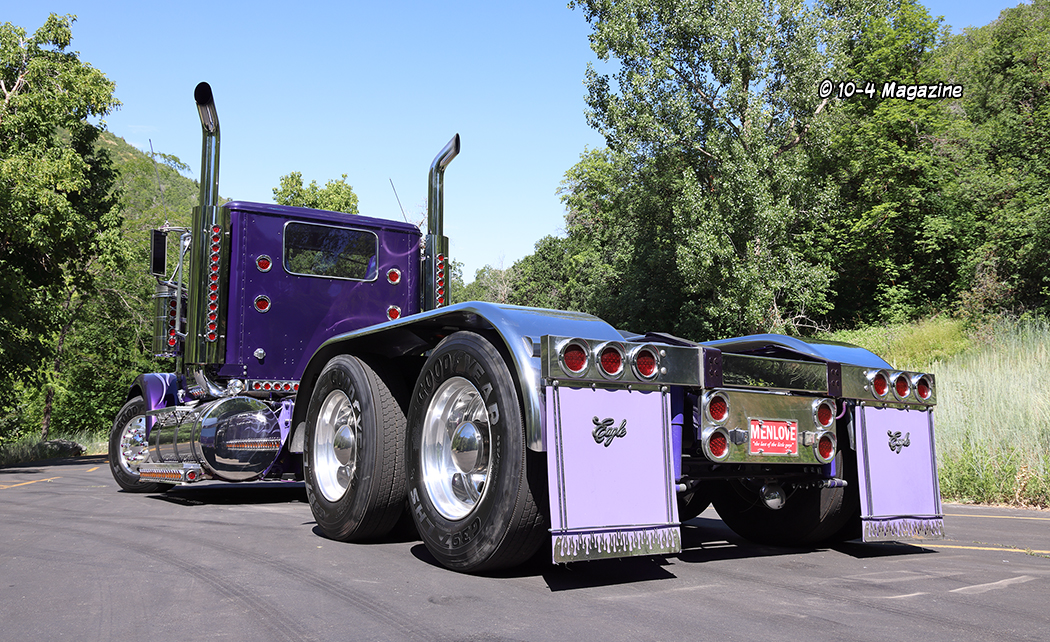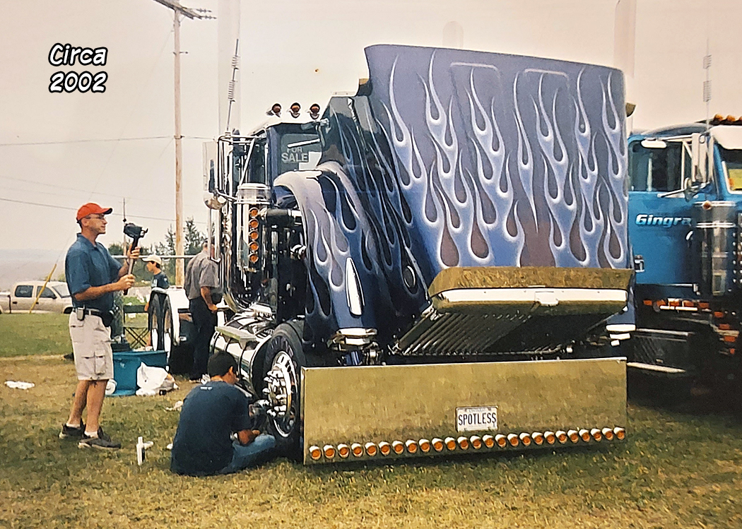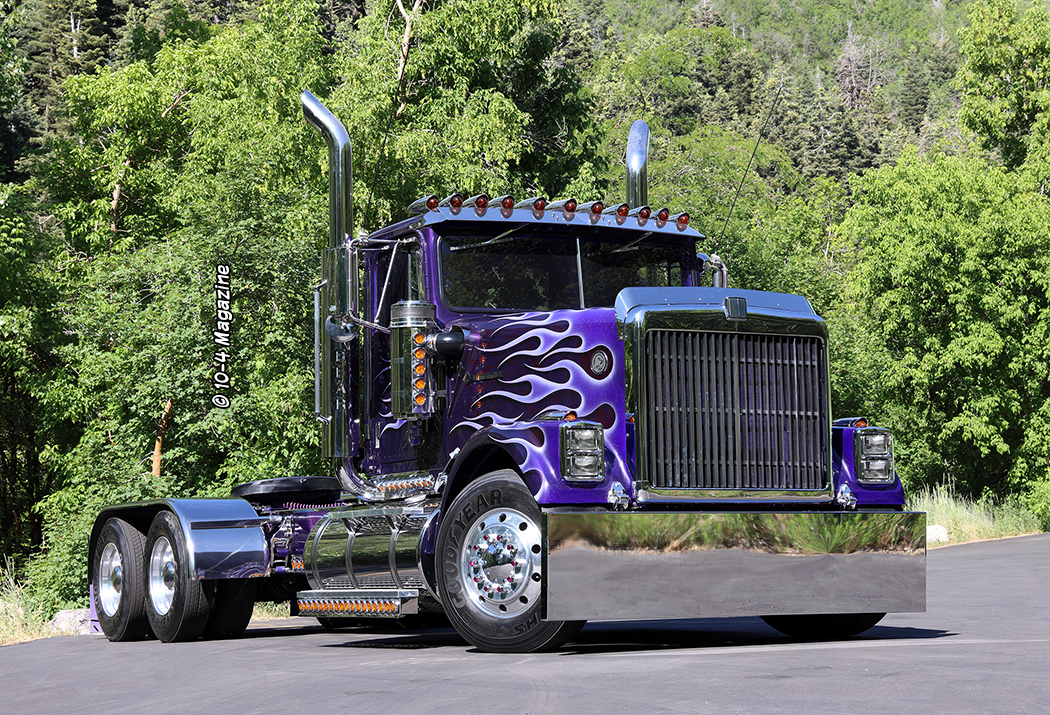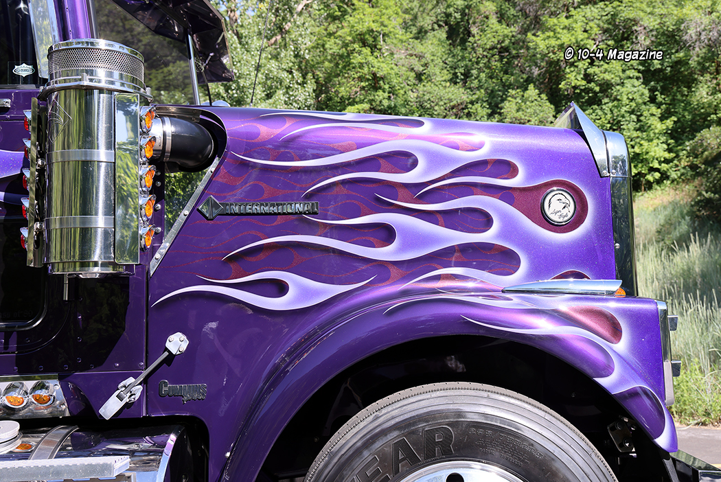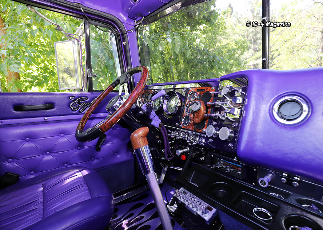 Over the next three years or so, Mike made many changes to the truck and won many awards, included being featured on a Shell SuperRigs calendar. Back in the day, that was the pinnacle of success for a truck on the show circuit. At some point, Mike removed the sleeper and plugged the hole, making it a daycab, completely re-did the interior in purple, and then added dark metallic red ghost flames to the sides of the hood. Meeting photojournalist Bette Garber at one of the shows, she apologized to Mike for not being able to get those ghost flames to show up in her pictures, to which Mike replied, “Don’t worry, you’ll see them next time!” At the next show, his hood was covered with bright metallic violet flames that could not be missed on top of those ghost flames, that were still peeking out from behind, as well.