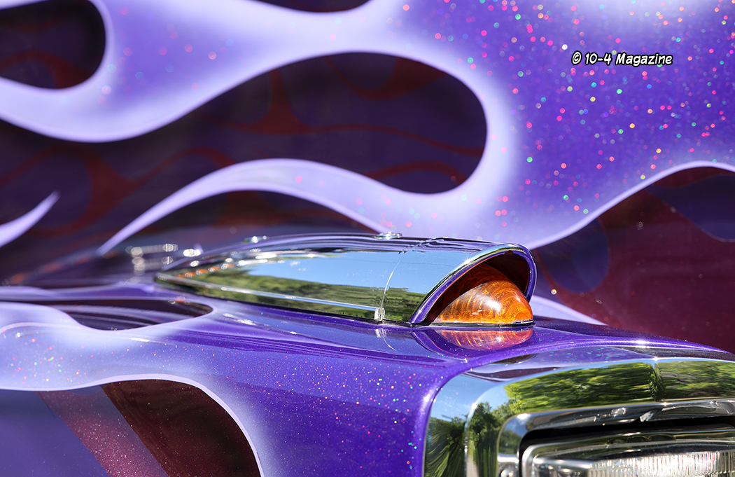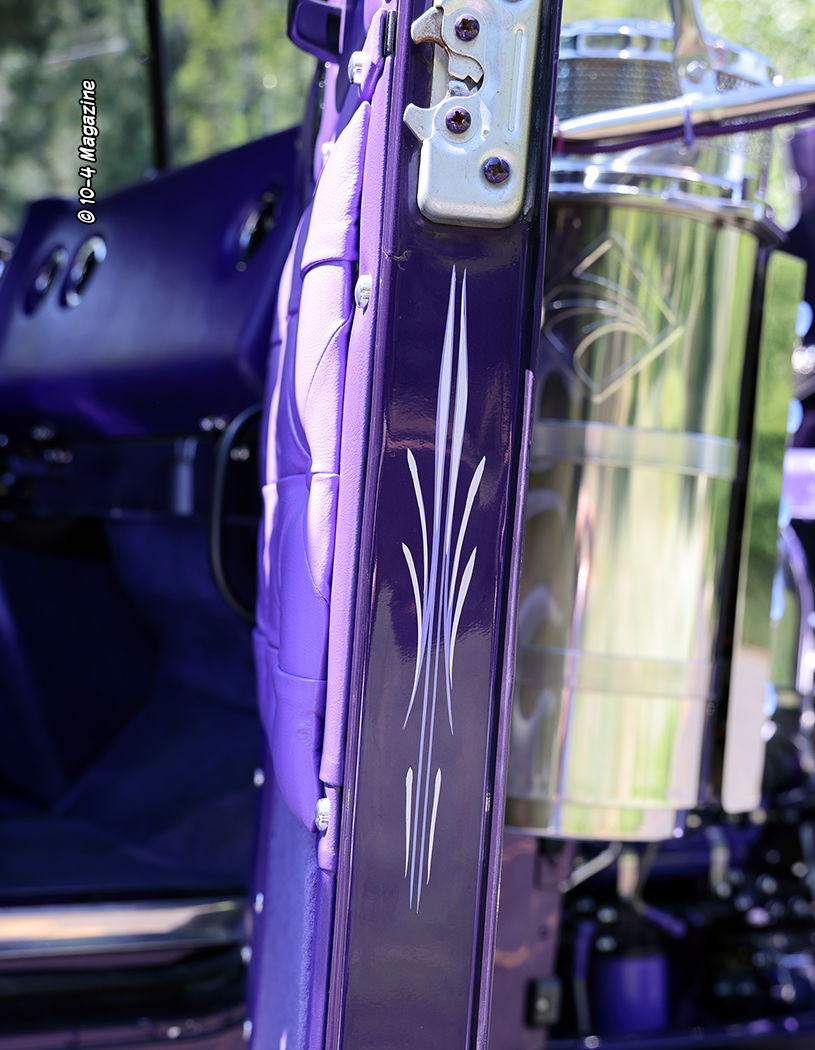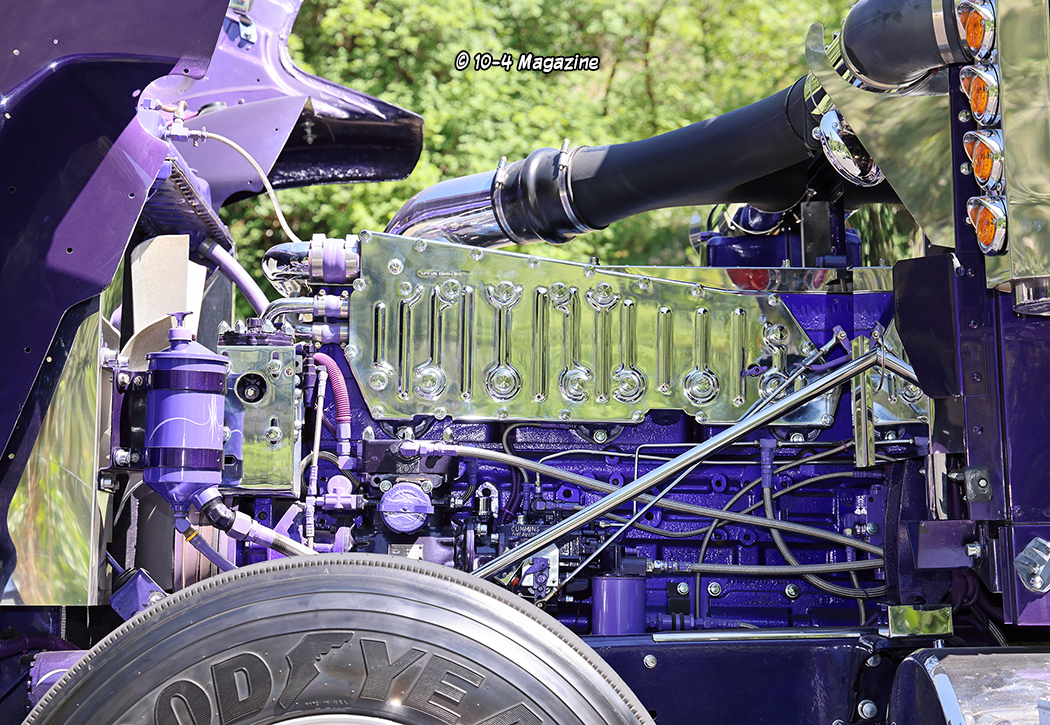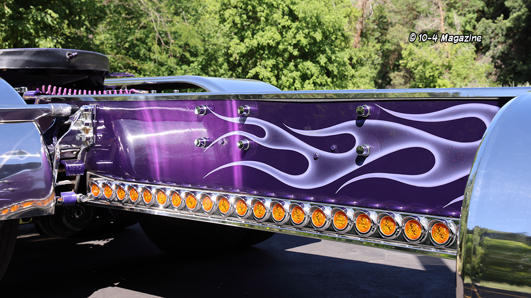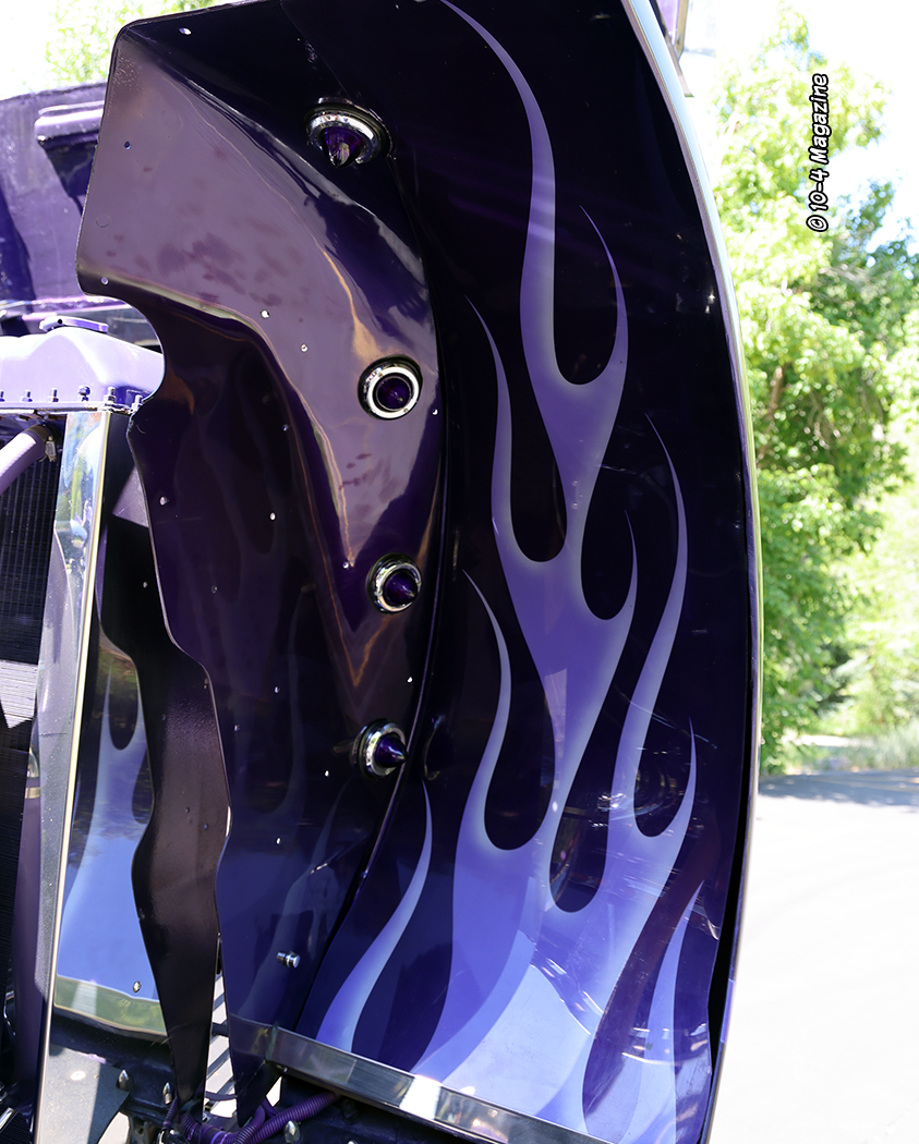 Most of what Mike did was a reaction to something that happened or something he saw at a truck show. Case in point – the engine. After losing that class to a fellow competitor named Neil Holsomback, Mike looked at Neil’s engine and thought, “I can do better than that!” Once he got the truck home, he pulled the engine, painted it purple, polished the turbo, and then covered the entire motor and engine compartment with chrome and polished pieces, pinstriping, and lights. He even lined the underside of the front fenders with plexiglass panels with flames and mounted eight purple watermelon lights, four on each side, under there, too. And guess what, he started winning trophies for his engine.