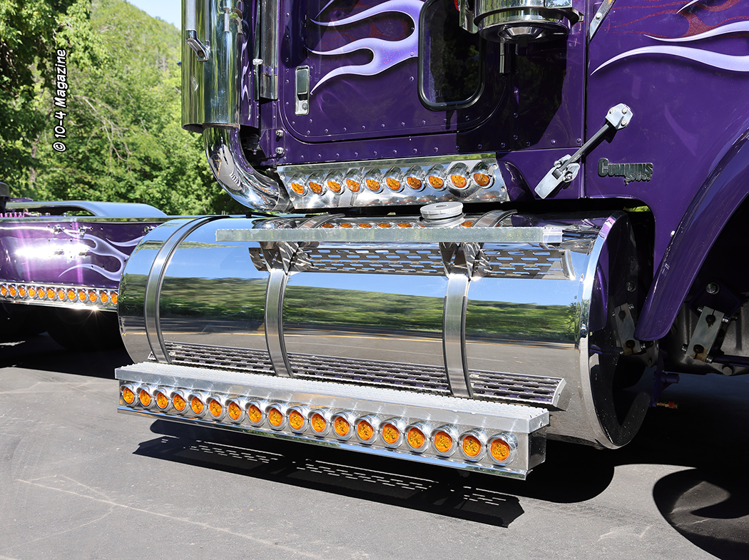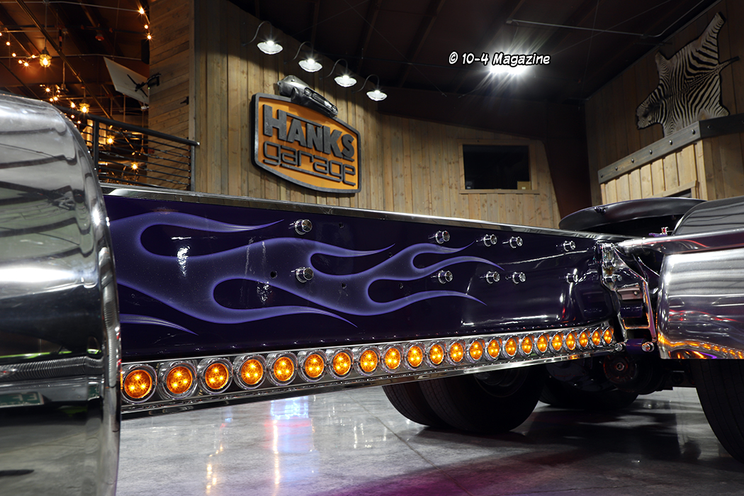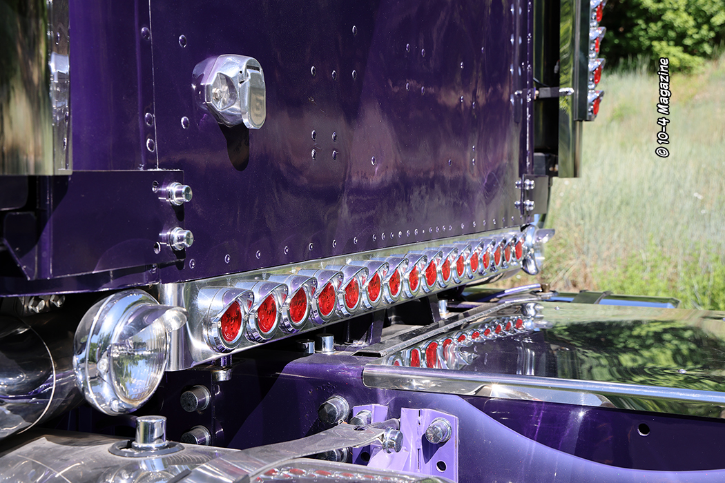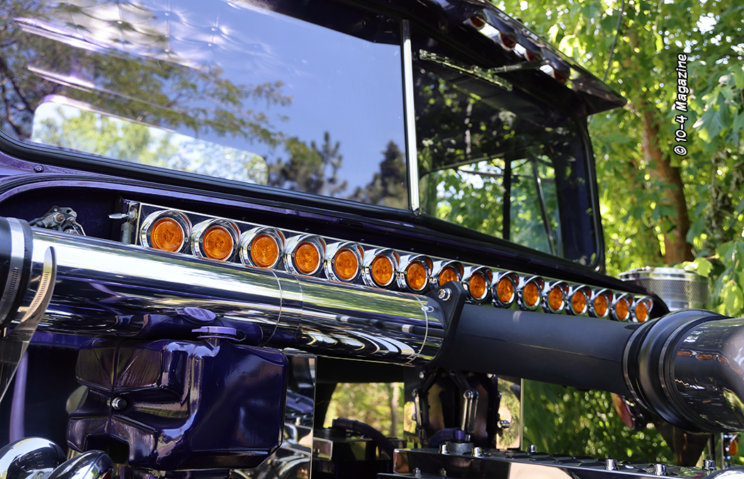 And speaking of lights, did we mention that this truck has a few of them? With 24 across the bottom of the frame on each side, 16 along the bottom of the back of the sleeper, 18 along the bottom of each fuel tank, 10 along the bottom of the cab on each side, another 5 on the front and back of each air cleaner, 12 up on top of the cab, and even a string of 16 across the firewall, under the hood, to light up the engine, there are lights all over this thing – 478 of them in total!
