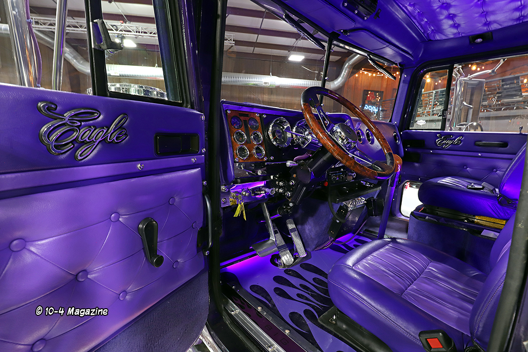 Remember, Mike was doing all this in the late 90s and very early 2000s, and he was doing it to an International Eagle, which nobody made custom accessories for. At a time when wood floors were getting popular, Mike installed a 5/8” thick plexiglass floor with flames underneath, and then surrounded the edges with purple neon tubes, that shined through the thick plexiglass and lit it up. He also modified chrome KW bezels to fit around all the gauges on his dash, modified and replaced the stock switches with toggle switches out of a Peterbilt, and painted and pinstriped everything, including the ends of the doors (I don’t think I’ve ever seen that).
