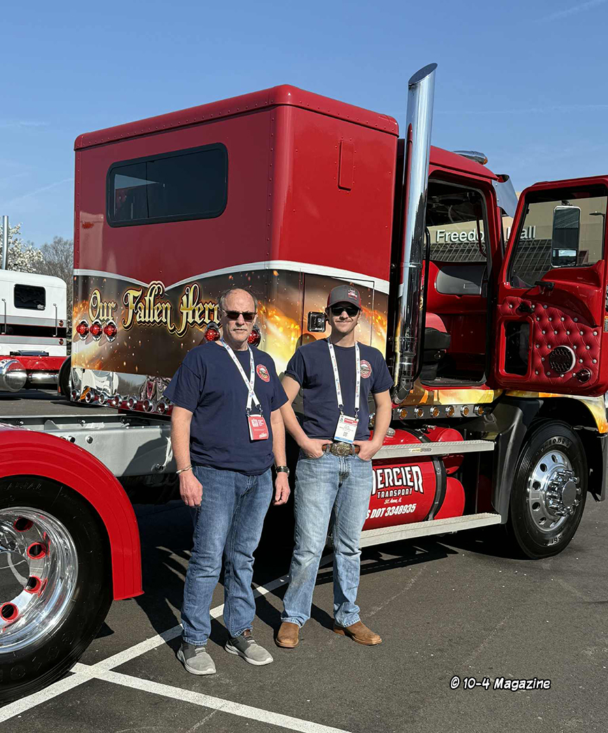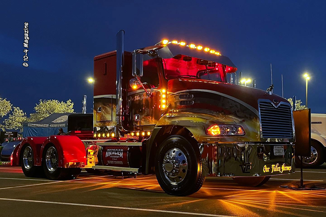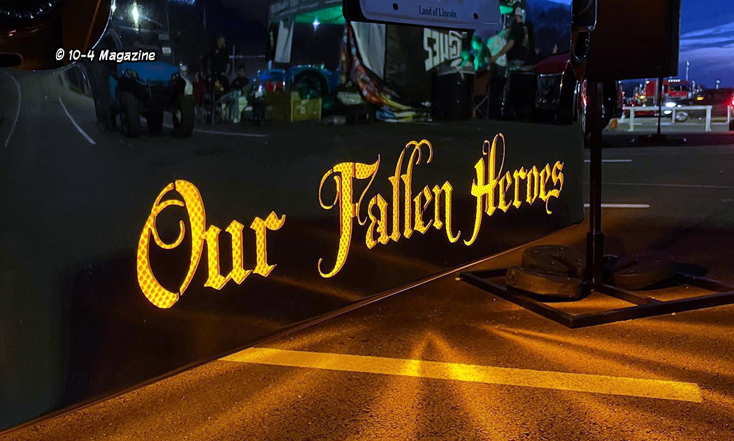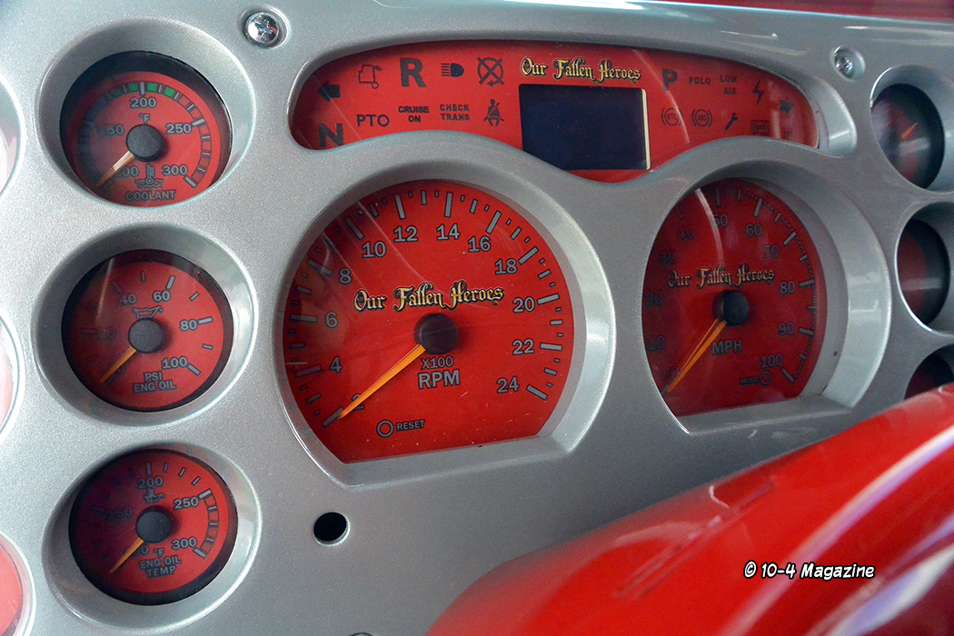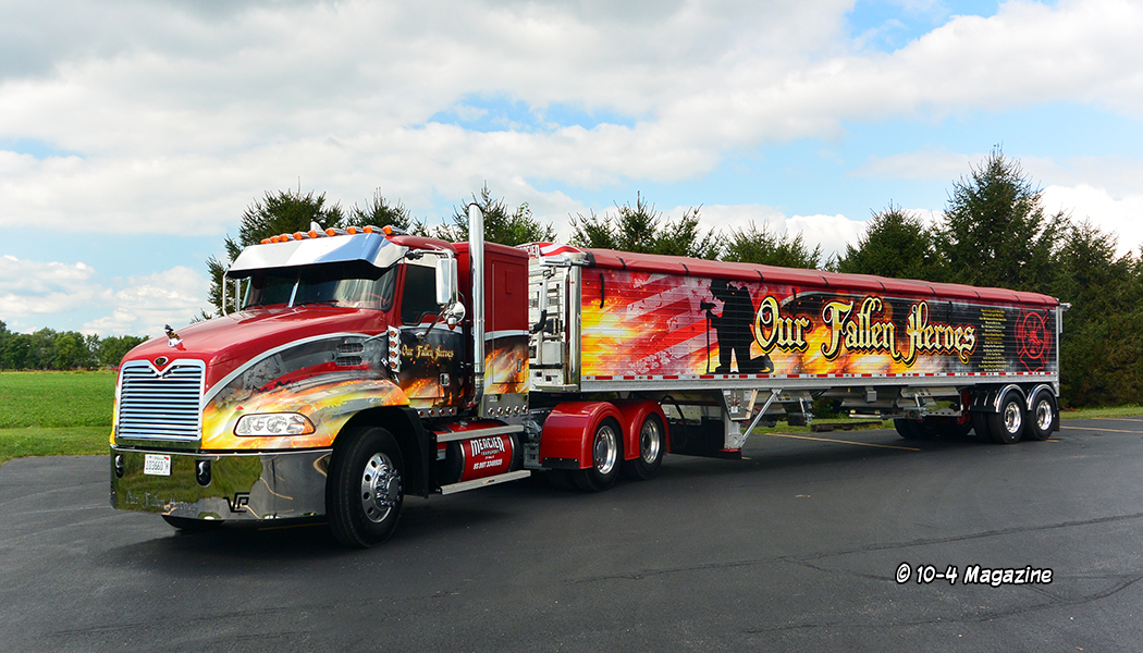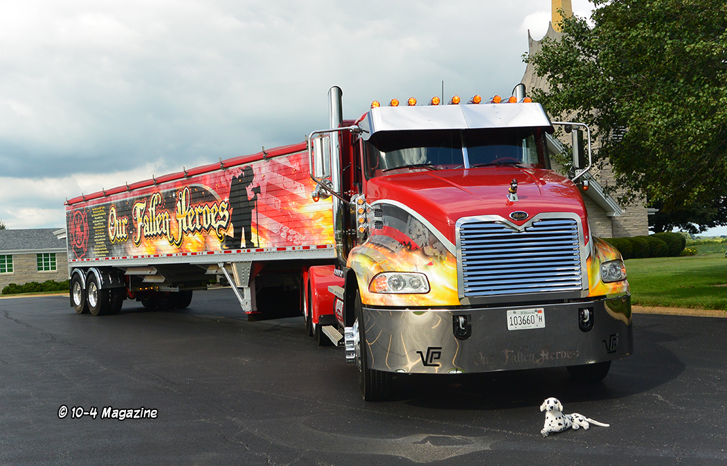 Brainstorming one day he settled on the “Our Fallen Heroes” theme for the truck and, over the years, she has changed to become the beautiful tribute she is today. She has an Eaton 10-speed transmission and Mack 3.36 rear ends from the factory, so she’s not technically a pure-bred by Mack standards, but she doesn’t have to be, because this little dog stands tall! After the theme was decided, Fastlane Wraps in Chebanse, IL designed the graphics and the truck was wrapped. The top part of the truck is the same red that is under her wrap (of course she’s red). They also designed and wrapped the first trailer, as well as the new Wilson trailer, seen behind it today.