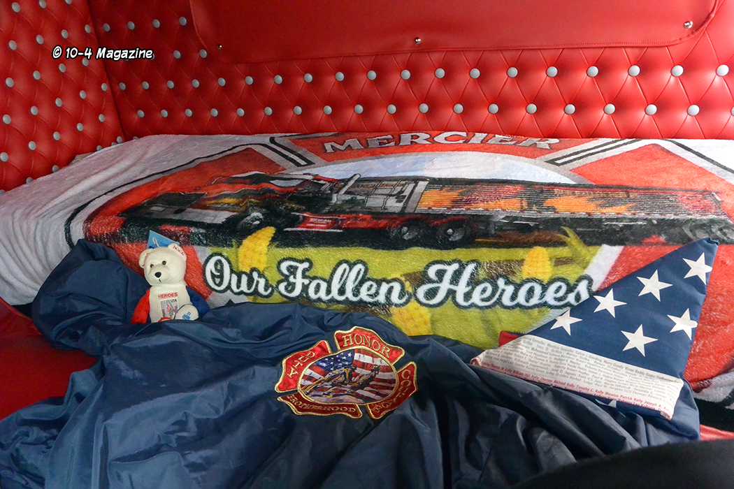 Inside Dylan’s sleeper, he had a blanket made with a picture of the truck and trailer and “Our Fallen Heroes” on it. Along with the blanket there are a few other very special things. Our friend Janice Skidmore gave us her brother’s NYFD jacket he was wearing on 911. Along with the jacket was his flag, with the names along the edge, and a 911 Beanie Baby. She wanted Dylan to have them and display them when he shows the truck to help remember her brother. Janice lost her battle with cancer on April 1, 2024. I miss our late night talks when I was trucking, and she was working as a guard at various locations in Reno.
