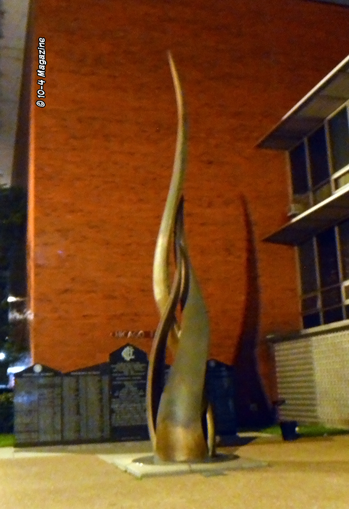 In 1961 the Robert J. Quinn Fire Academy was built on the site of Mrs. O’Leary’s barn – the supposed starting point of the Great Chicago Fire. On the west side of the building is a 33’ tall abstract bronze statue called “Pillar of Fire” in remembrance of the tragedy. Artificial streetscapes are located inside the building, which is used for mock firefighting exercises, and classrooms are in a three-story wing on the southeast side of the building. The site was later designated as a Chicago landmark on September 15, 1971, 100 years after the Great Fire happened.