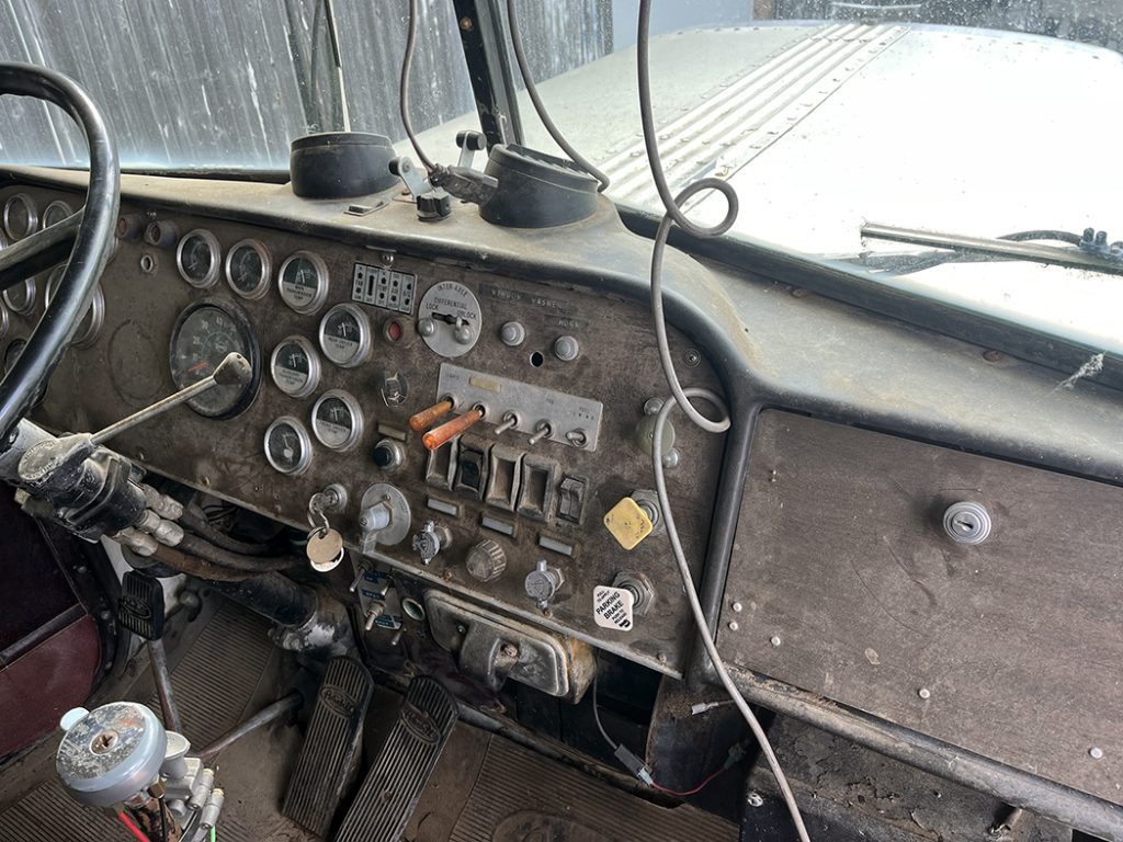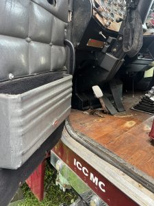 Note of reference: in the cabovers, the shifter tower was connected to the frame and not to the cab, so when the cab flexed, it opened a gap between the shifter base and the floorboards.  This allowed both heat and cold to infiltrate the interior.  It wasn’t until later that they figured out how to use cables to shift an auxiliary transmission, allowing the builders to close the gap and let the shift tower float with the cab.  To combat this, most drivers took their jacket off and ran the shifter through one sleeve, then wrapped the rest around the shifter base to seal it.  This also helped to reduce the temperature change in the shifter head when changing gears or just resting one’s hand on the shifter knob.