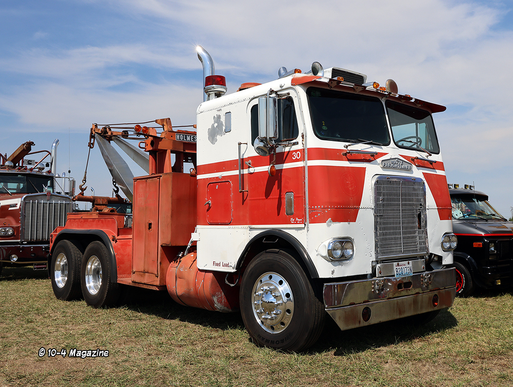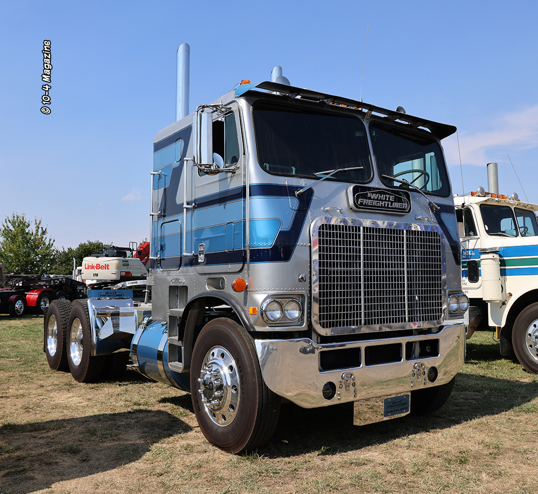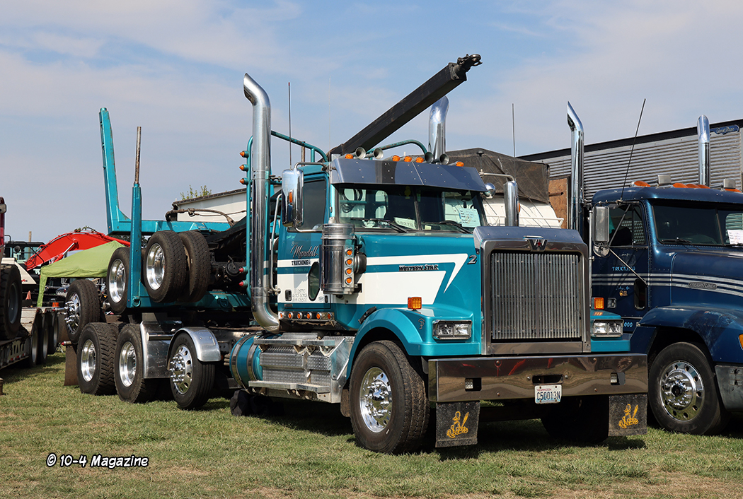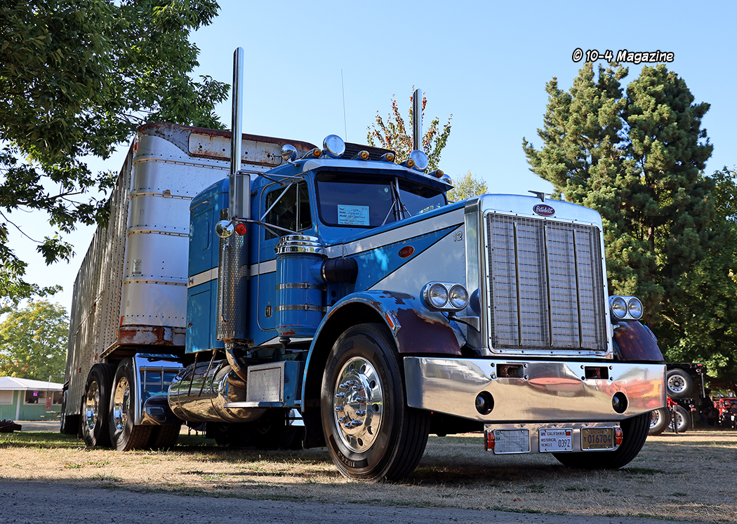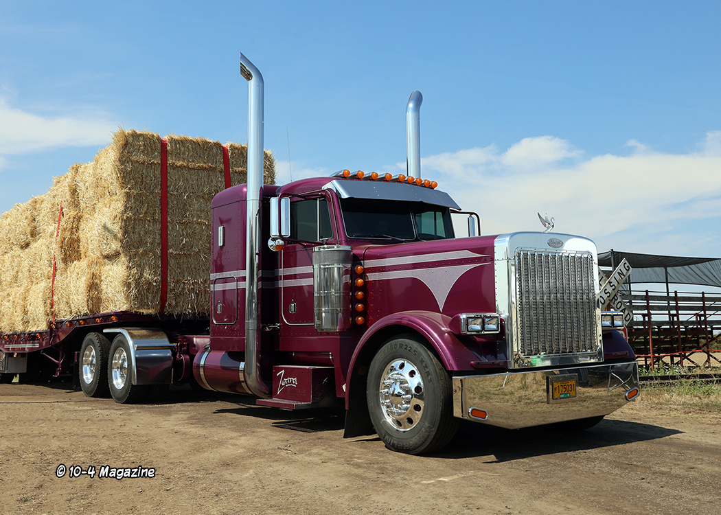 A few other standout rigs included a turquoise and white 2024 Kenworth W990 and matching tanker owned by Perseverance Transfer, a tan and brown 1997 Peterbilt 378 service truck from West Span Hauling, and a blue and white (along with a little rust) 1974 Peterbilt 359 and livestock trailer owned by Steve Marciel.  It was also cool to see past cover trucker Steve Vermeer (February 2010) and his stellar 1979 Peterbilt 352 cabover, along with his son Travis, parked side-by-side (Travis was just eight years old when we met him and now he has own truck – a dark blue Peterbilt 389).  There was also a nice magenta-colored 379 Peterbilt with violet stripes, pulling a matching stepdeck loaded with hay, brought out by Zweifel Custom Farming (ZCF).