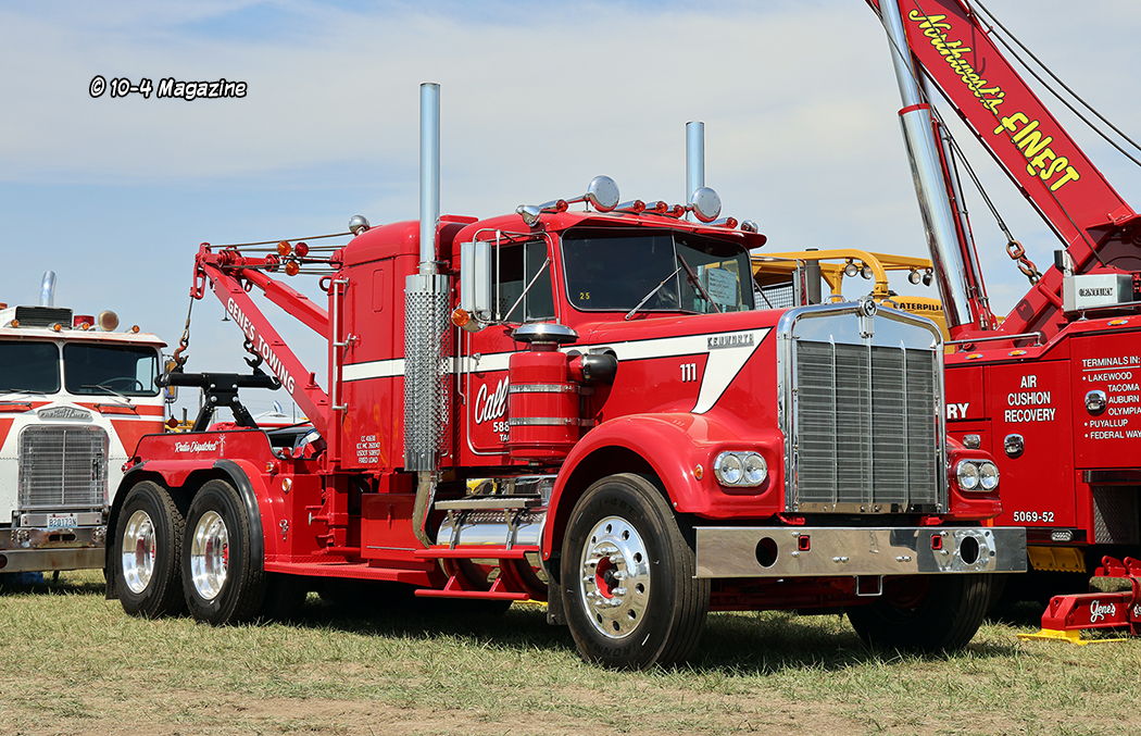 Some of my personal favorites this year included a red and white 1966 Kenworth W923 wrecker owned by Gene’s Towing out of Lakeland, WA, along with an old Freightliner cabover wrecker, complete with a Holmes unit, parked behind it, presumably from the same company.  There’s just something about old tow trucks that gets me excited.  Another one of my favorites was a yellow 2-axle 1984 Peterbilt 359 with red and orange stripes owned by Joe Kroon.  This little hobby truck was also fitted with a small flatbed, and it was super cool.  But my absolute favorite truck this year was probably Dave Blake’s cream and red 2024 Peterbilt 389 daycab from Auburn, WA – it was stunning in the sun, and looked great at night, too!
