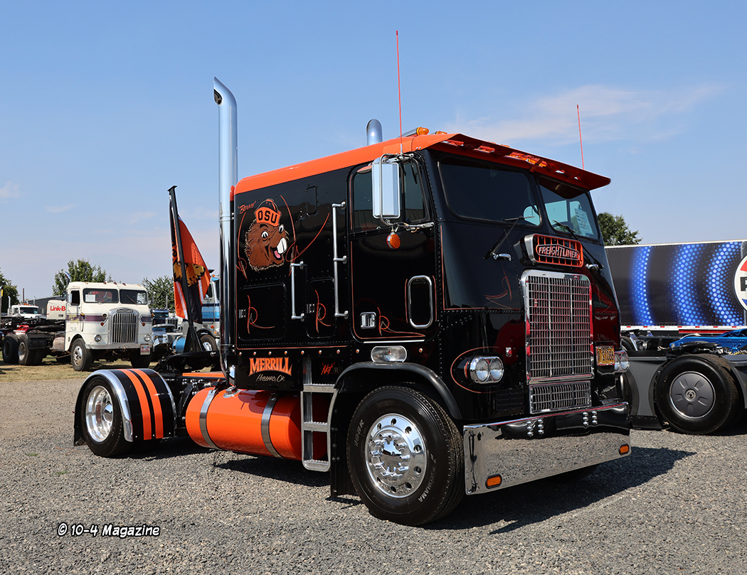 This year’s featured brand was Freightliner, and there were a bunch of cool old ones there to represent the marquee, including a white 1951 cabover, a silver and blue Powerliner, and a red and black 2-axle 1988 FLC 120 hooked to a short Utility van.  A gold-colored 1969 White Freightliner 8164T cabover owned by Josh Youngman was turning heads, too.  Of course, no Brooks show would be complete without the late Frank Merrill’s OSU themed black and orange 1982 Freightliner cabover on full display.  We sure miss you, Frank!