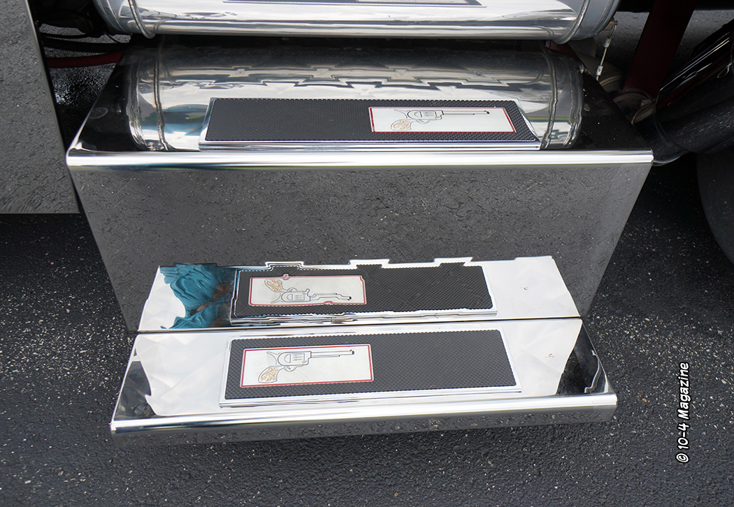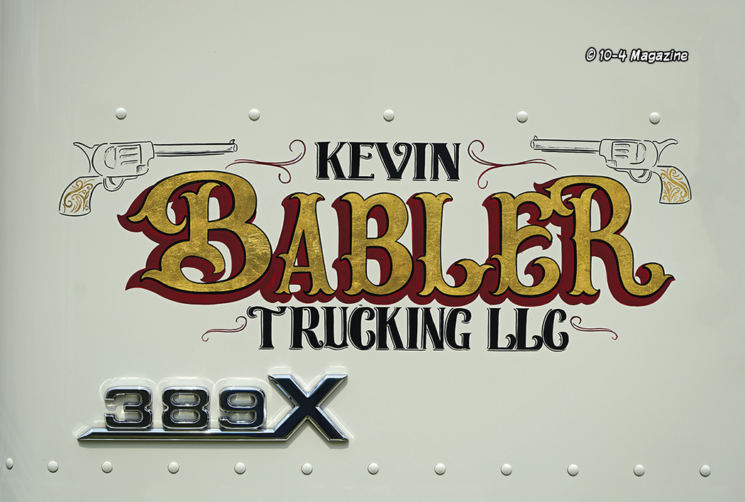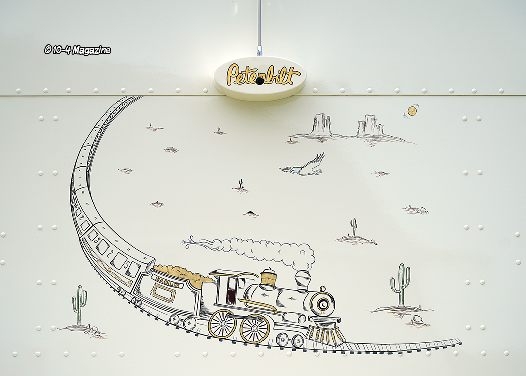 The most interesting thing about this truck is the pinstriping.  The artwork is detailed and there is something to see around every corner of the truck, inside and out.  Kevin wanted an old western gunslinging theme with gold leaf, trains, and six shooters, all while incorporating the gold rush.  Brittnea of Lady Lines Pinstriping knocked it out of the park, to say the least.  One of the cool things about this artwork is that I actually got to photograph Brittnea in the process of some of it on May 21, 2023, when I did the photography for her article.  I had photographed Kevin’s 389X pulling a 2025 Trail King, but that one is basically kept as a show trailer.  Kevin uses his truck daily and can normally be found pulling a 2025 Reitnouer stepdeck trailer hauling almost any type of equipment including finished trucks, snow and ice equipment, and truck chassis.