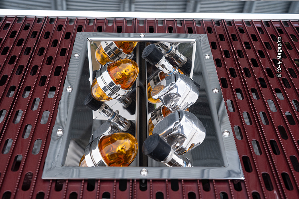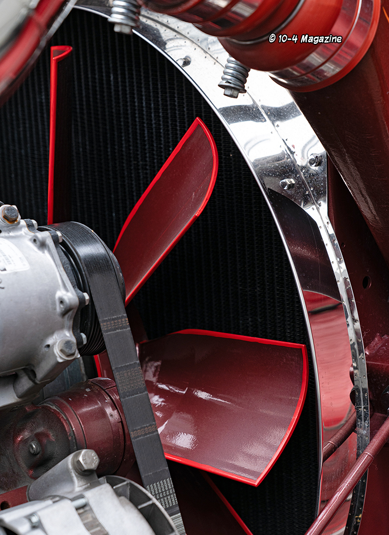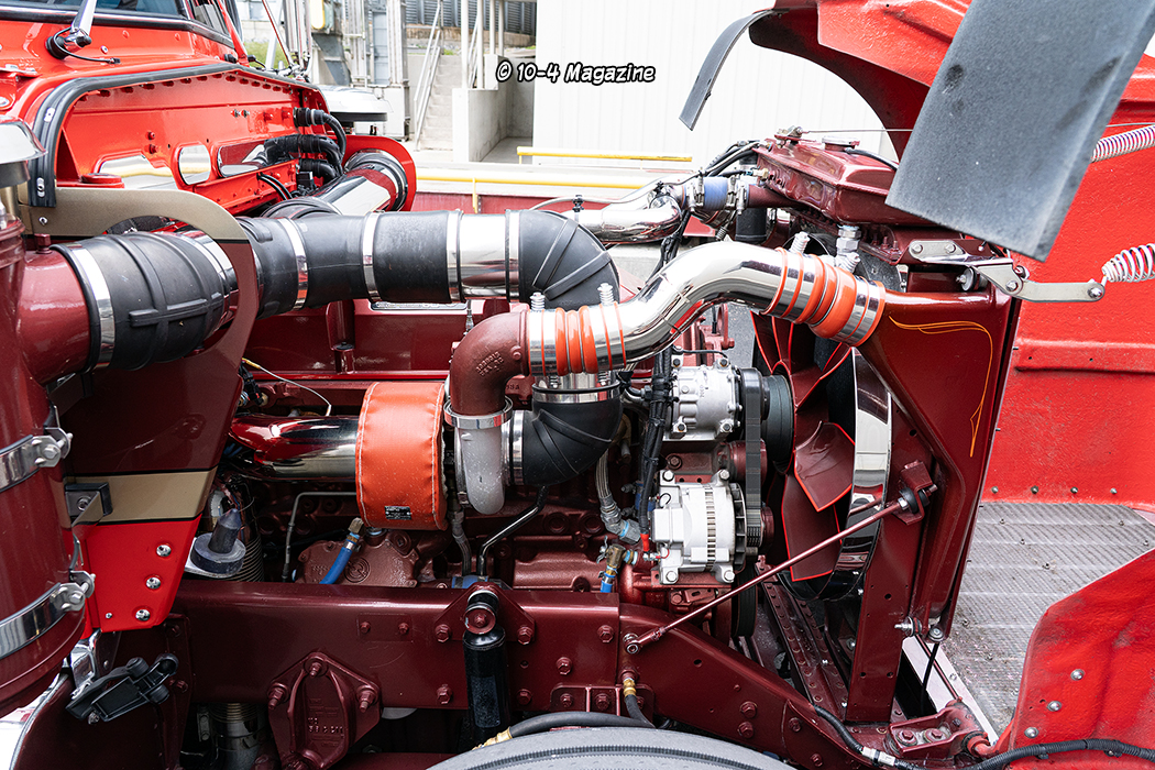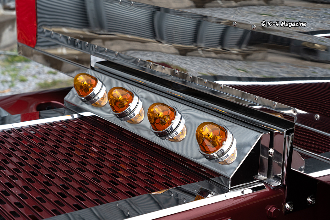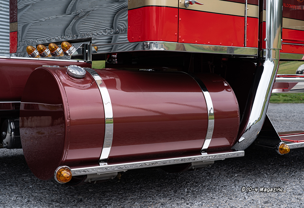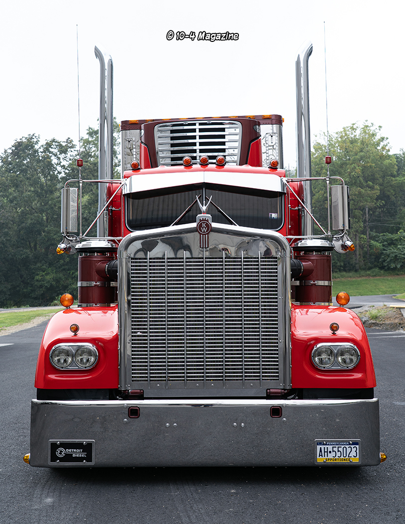All the tear down, frame stretch work, and paint was done in-house by Dan, his dad, and the third owner, Kevin Weisenberger. Some custom pieces on the truck include the chromed factory wiper arms, grab handles, cab stack mounts, all stainless steel tubing and a custom stainless steel fan shroud. Once Dan, Greg and Kevin finished their work on the truck, it was taken down to Keith Nolt at Trostle Hill Garage, located in Mohnton, PA, for final assembly. Keith put the entire truck back together, including setting the motor, cab, hood and bunk on the frame. Keith also did all the plumbing and wiring work. The front axle is sitting on a Shane Kurtz air ride kit, with leveling valves done by Trostle Hill Garage, and 6” Lincoln Chrome stacks were chosen for the classic rig’s exhaust.